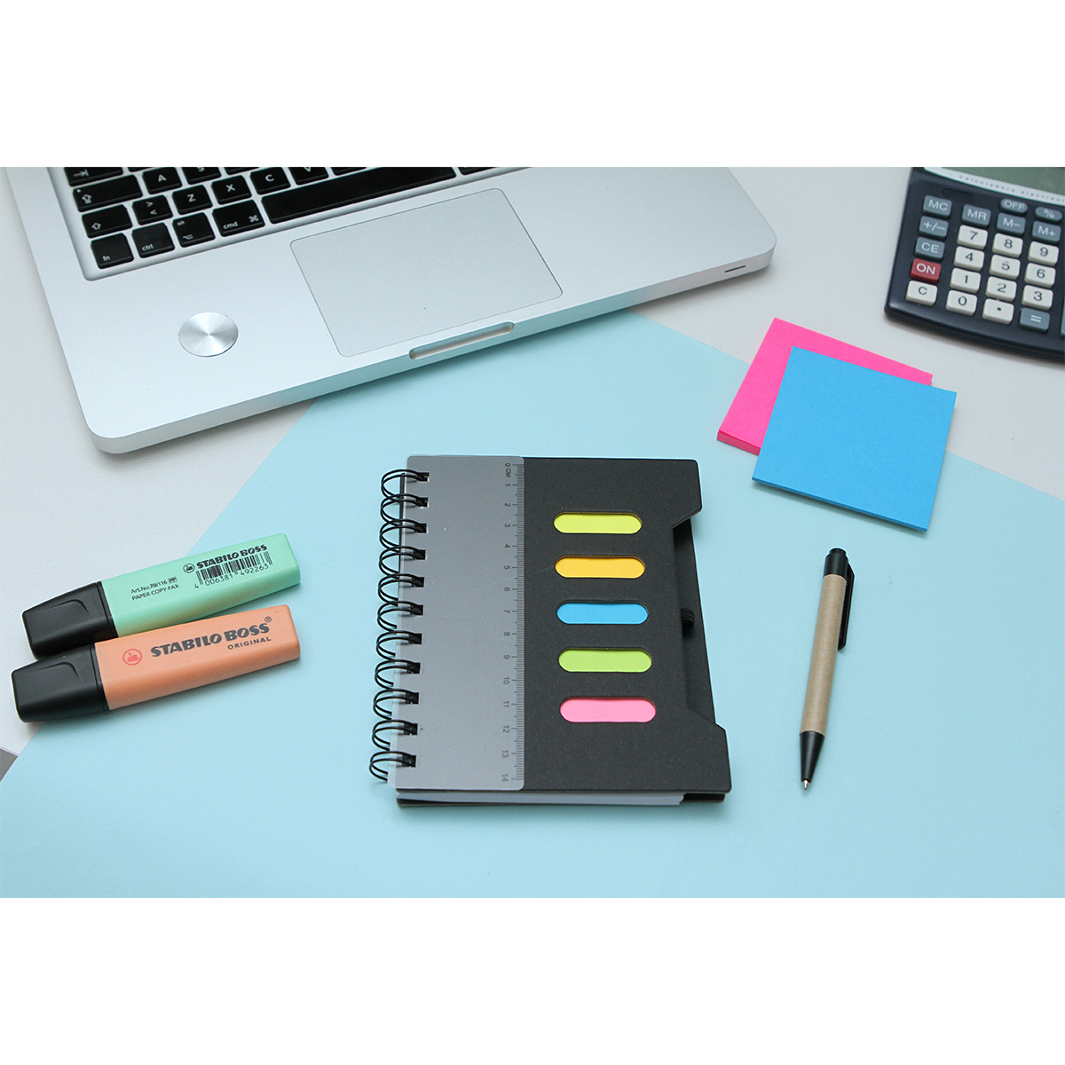 Libreta ecológica color negro con 70 hojas rayadas, viene acompañada de un bolígrafo con tinta negra, incluye 125 banderitas de colores en cinco tonalidades diferentes, lo que te permite marcar y resaltar páginas o secciones importantes. También cuenta con una regla de 14 cm incorporada en su diseño.