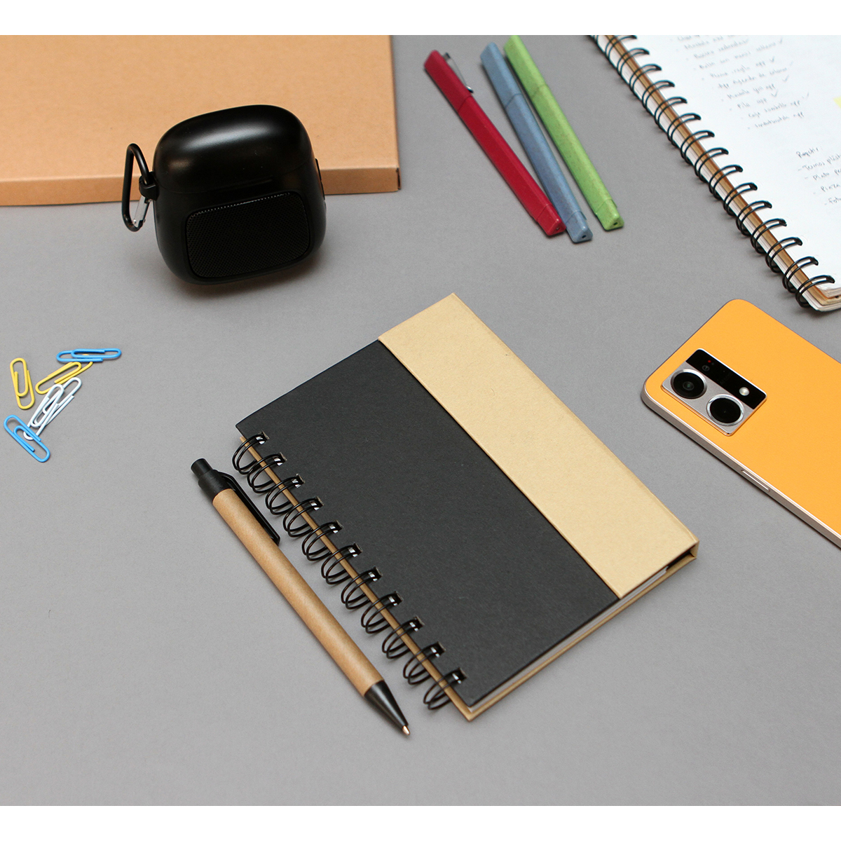 Libreta ecológica bi-tono con 60 hojas de raya, bolígrafo tinta negra, 25 notas adhesivas y banderitas de colores (100 en 4 colores). Con un tamaño compacto A6, la libreta Génova es fácil de transportar.