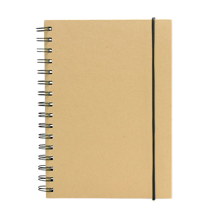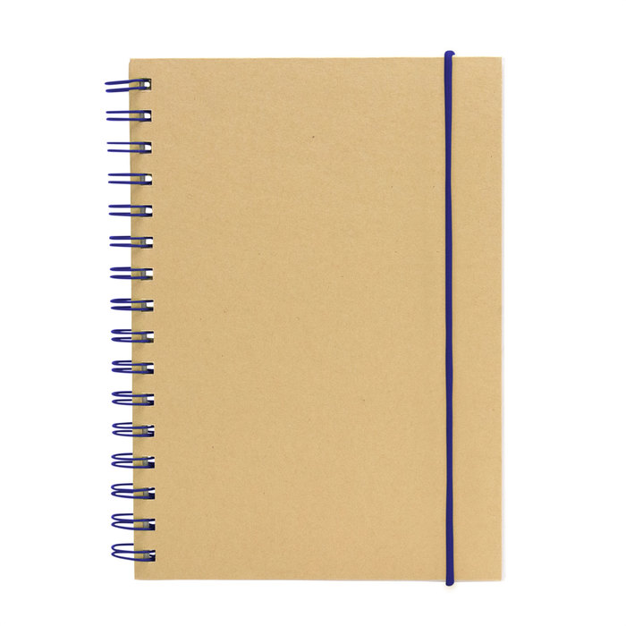21 x 14,7 cm. Cartón y Papel. Libreta espiralada. Tapa recubierta en papel kraft de 120 g. Interior de 70 hojas blancas rayadas de 80 g. Cierre con banda elástica y espiral del mismo color.