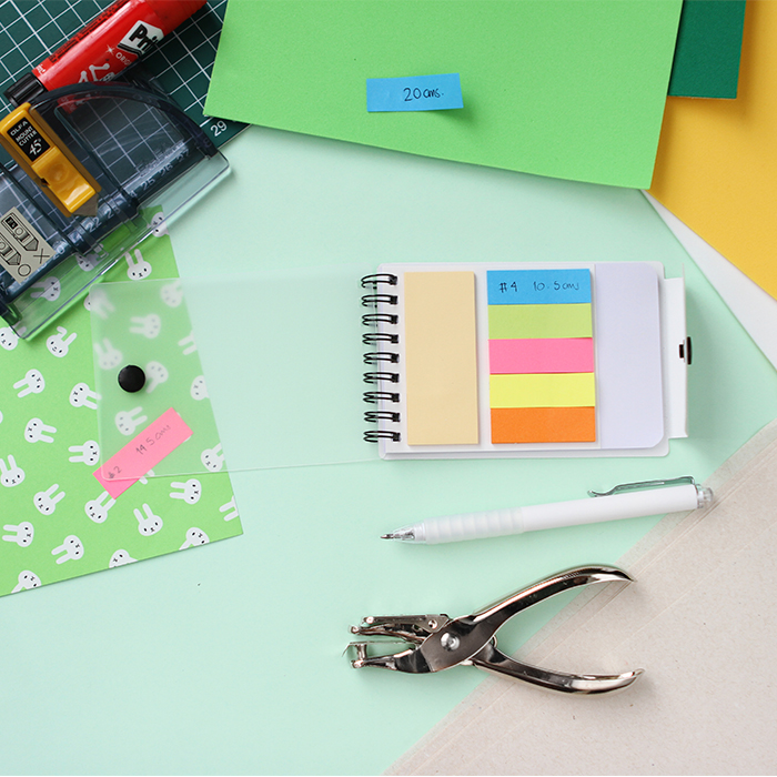 Libreta con pasta plástica 150 hojas rayadas y banderines adheribles.