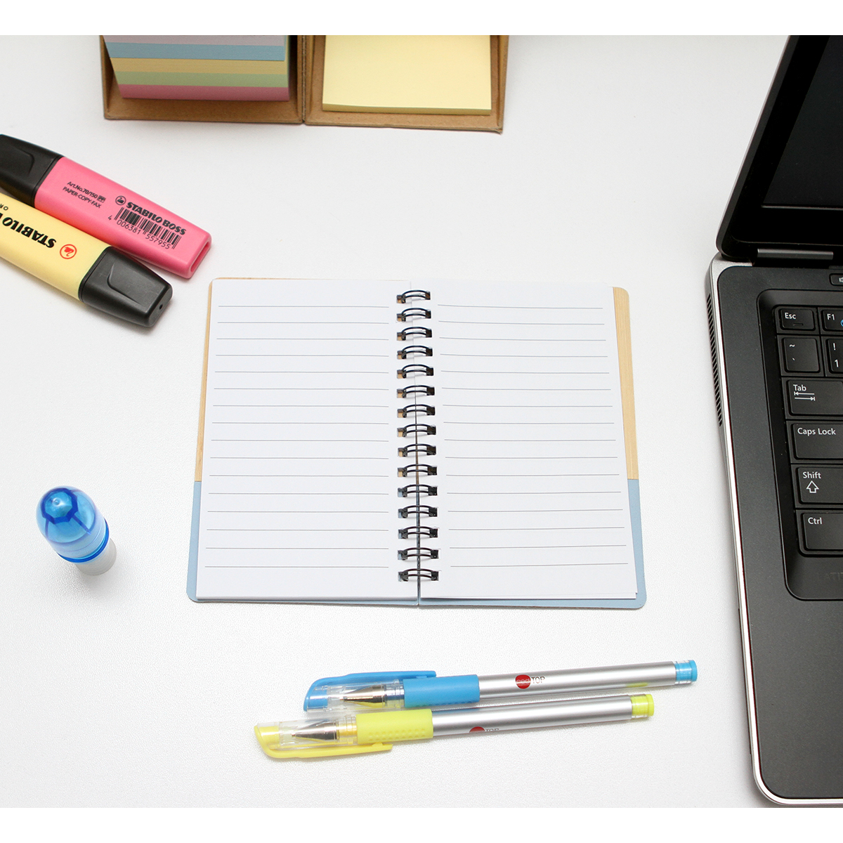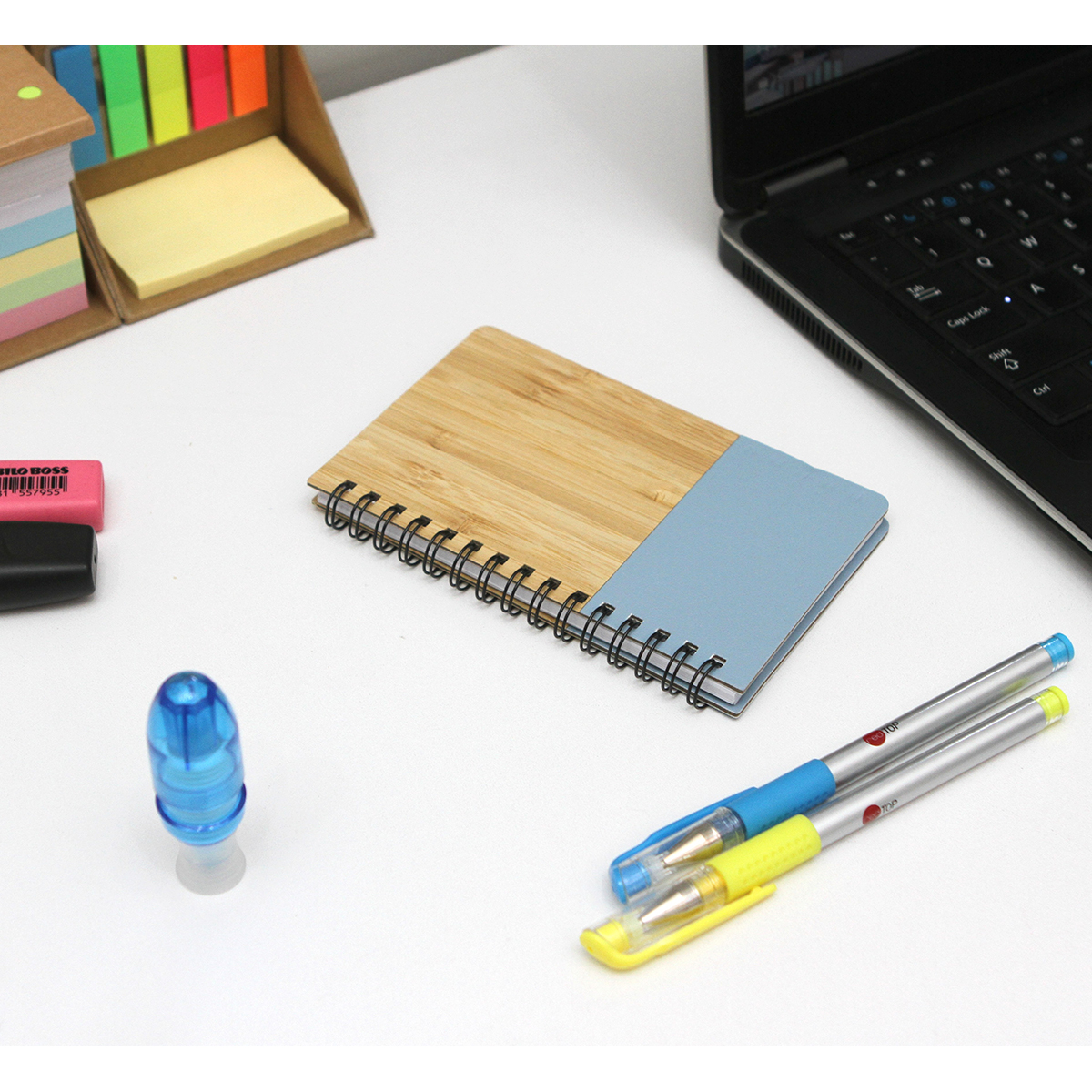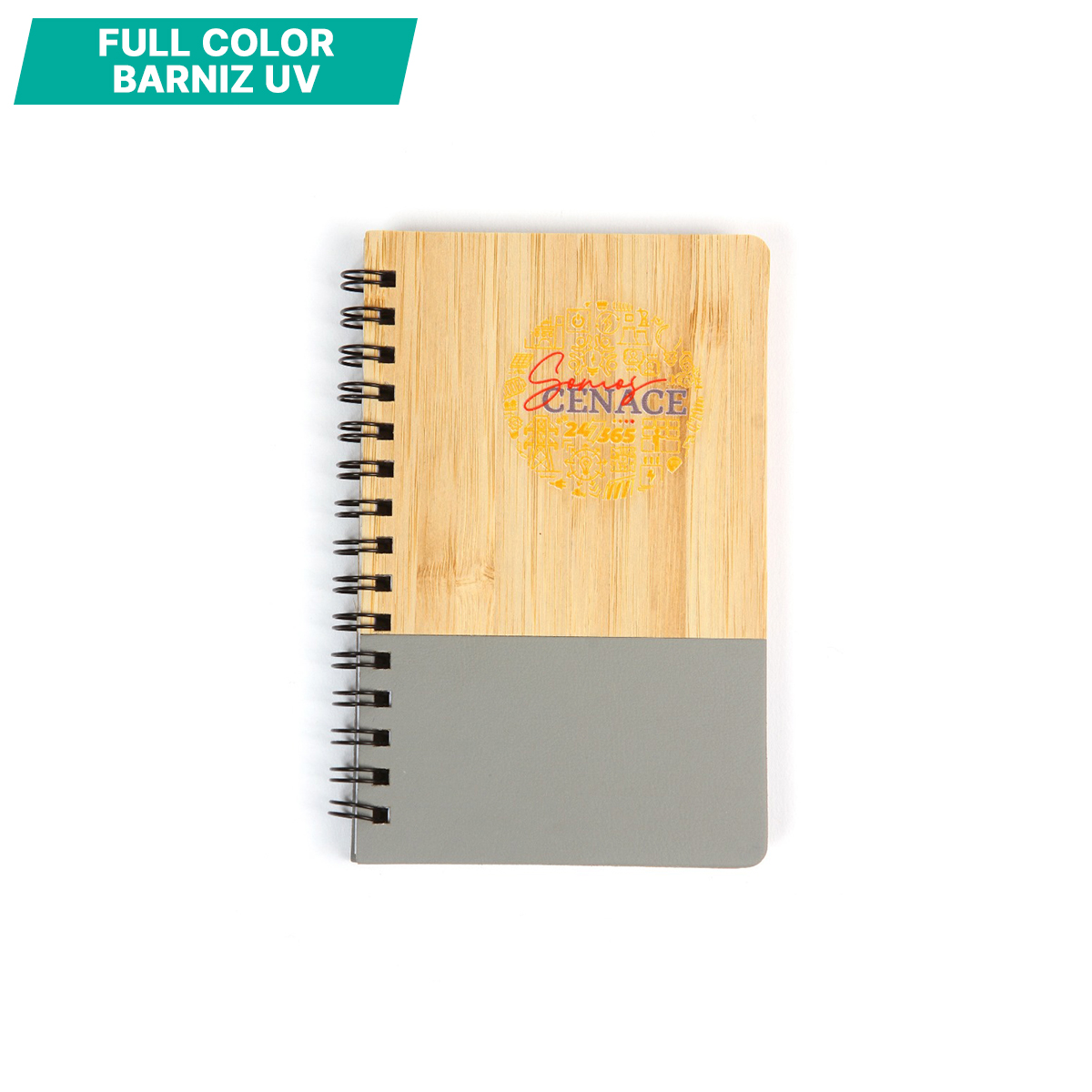 Libreta con pasta de bambú y detalle de color en plástico PU, espiral metálica y 60 hojas rayadas de 70 g. Tamaño A6.