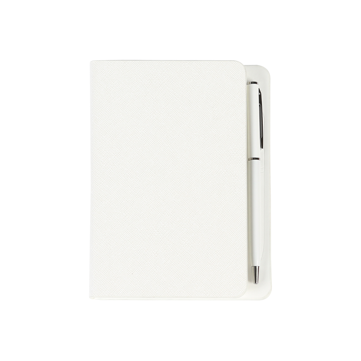 Libreta fabricada en curpiel con imán porta pluma, 80 hojas de raya y bolígrafo metálico tinta negra.