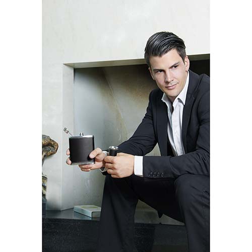 Set de licorera con tapa de rosca para evitar derrames, 2 vasos metálicos con manga de curpiel, 1 embudo y caja de regalo.
