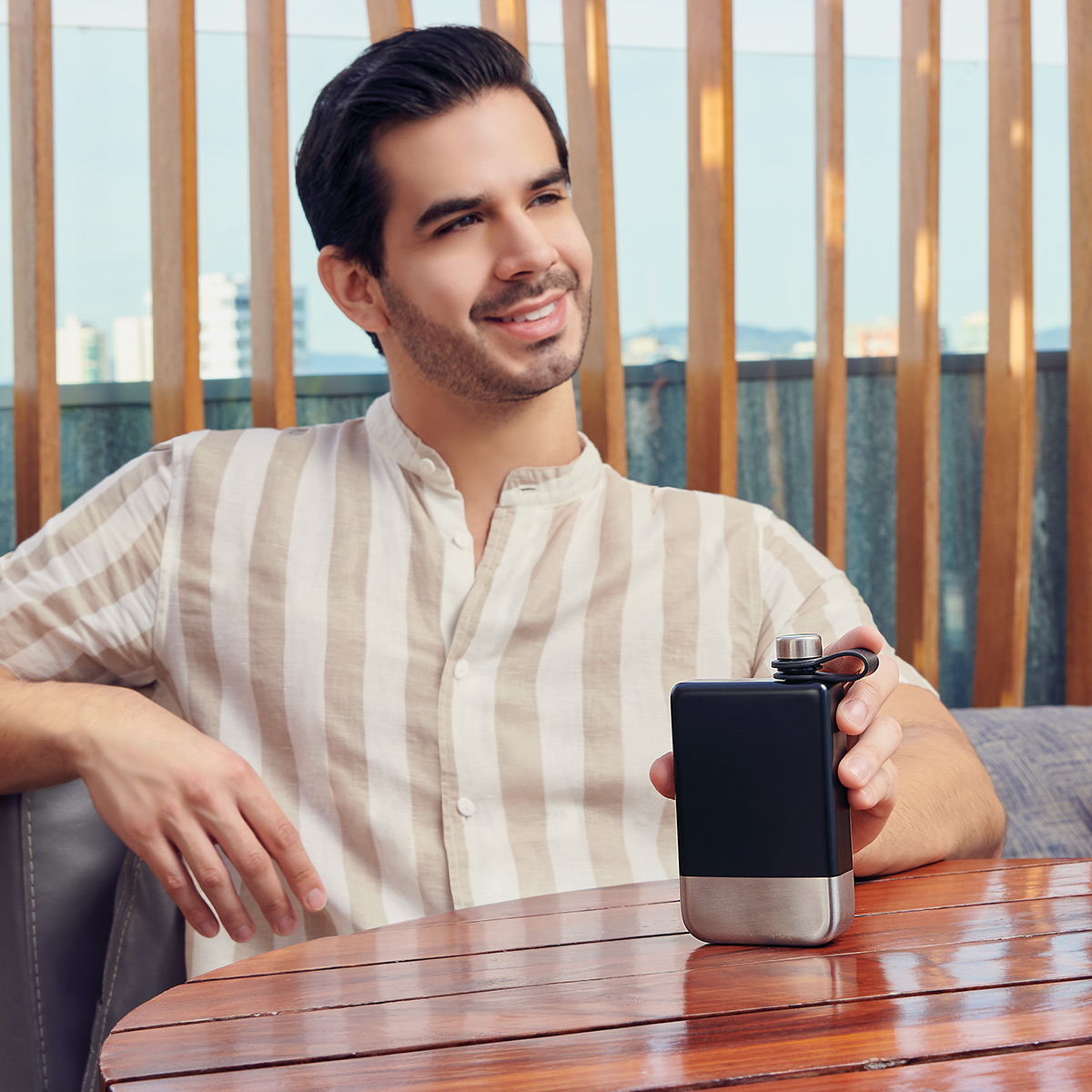 Licorera discreta y ligera con tapa de rosca para evitar derrames. Incluye mini asa de silicón para transportarla fácilmente.