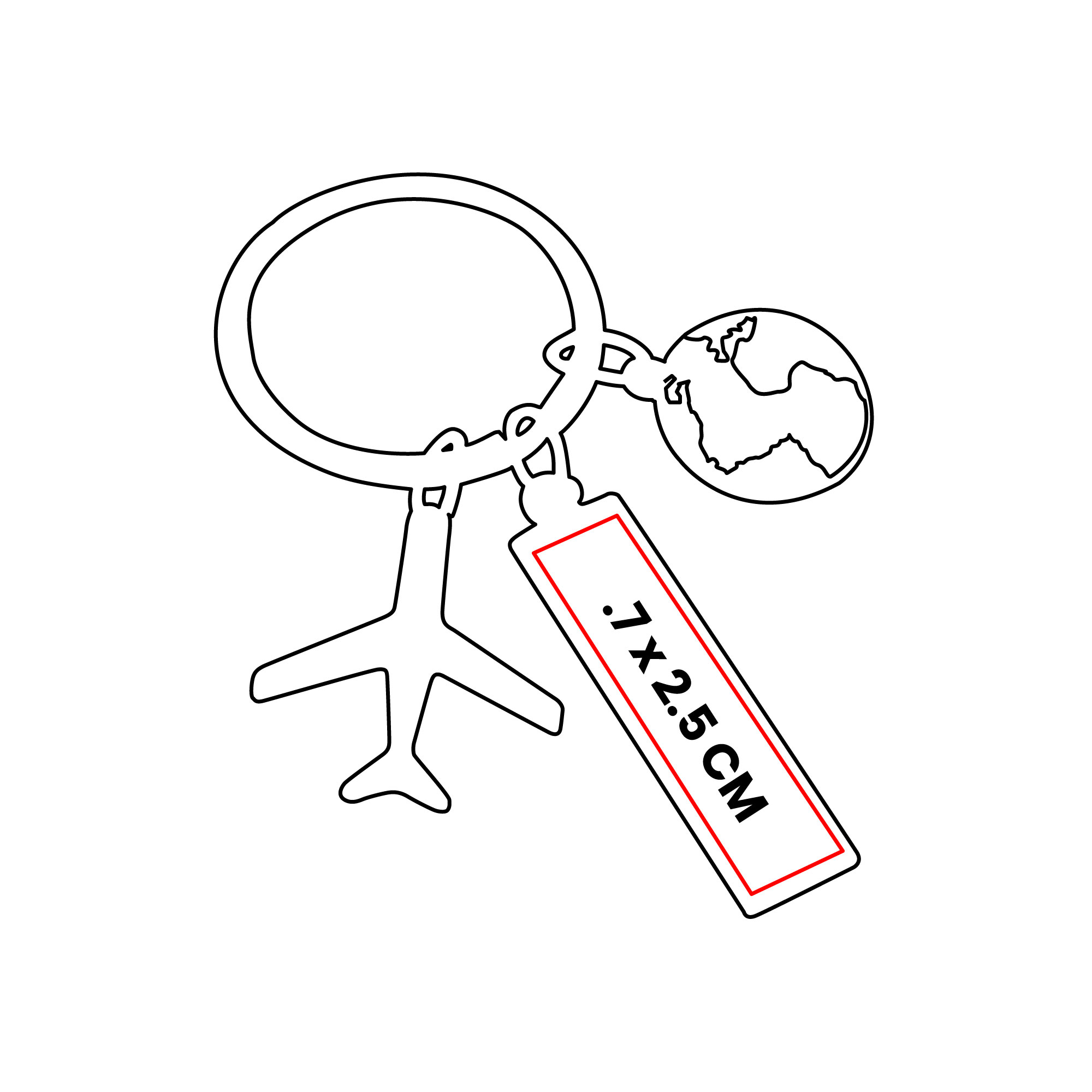 Llavero metálico con una placa para grabado, 1 dije de avión y 1 dije de mundo. Su diseño evoca el espíritu aventurero y la pasión por los viajes. Incluye caja individual.