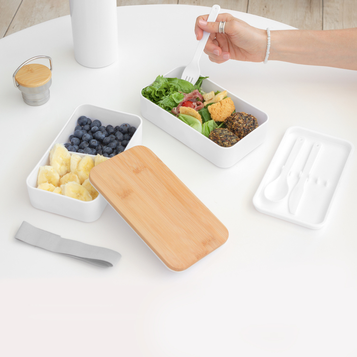 18.5 x 10.5 x 9.7 cm. Bambú + PP. Contenedor de alimentos con tapa de Bambú. Posee dos compartimentos plásticos, un separador y bandeja porta set de 3 cubiertos (cuchillo, tenedor, cuchara). La tapa de bambú debe presionar firmemente la bandeja donde se fija el juego de cubiertos. Cierre con sujeción elástica color gris. Producto apto para microondas (sin la tapa). Importante: solo se puede calentar la comida, NO sirve para cocinarla.