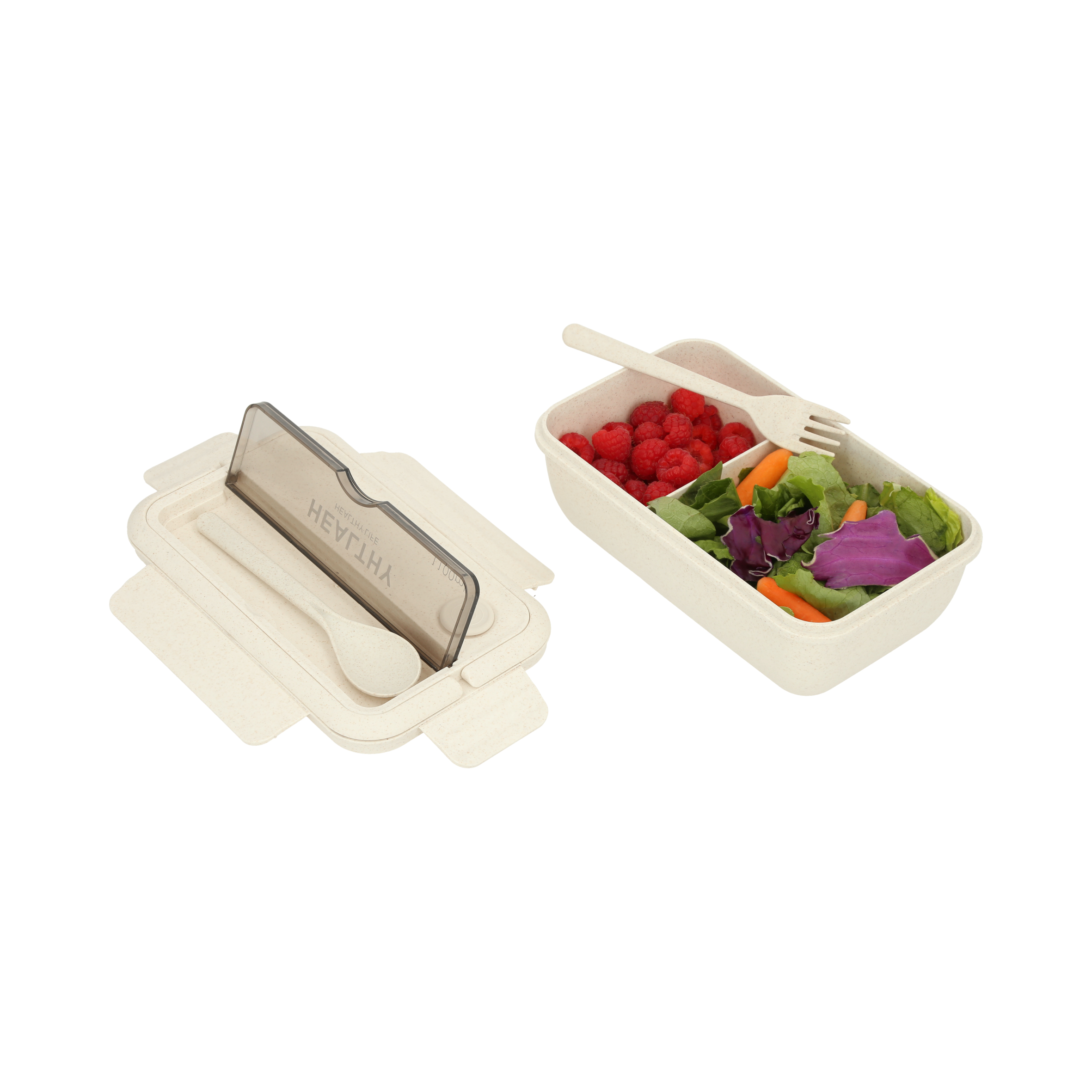Contenedor para alimento de wheat Straw, con 2 compartimentos para alimentos,1 para cubiertos en la parte superior y soporte para celular. Incluye cuchara y tenedor. Capacidad de 1100 ml.