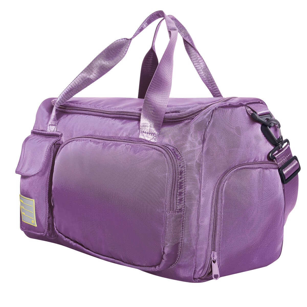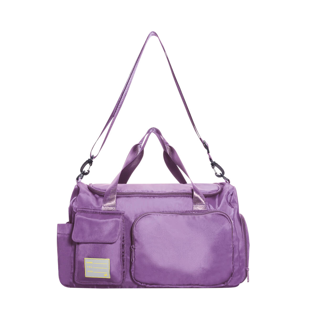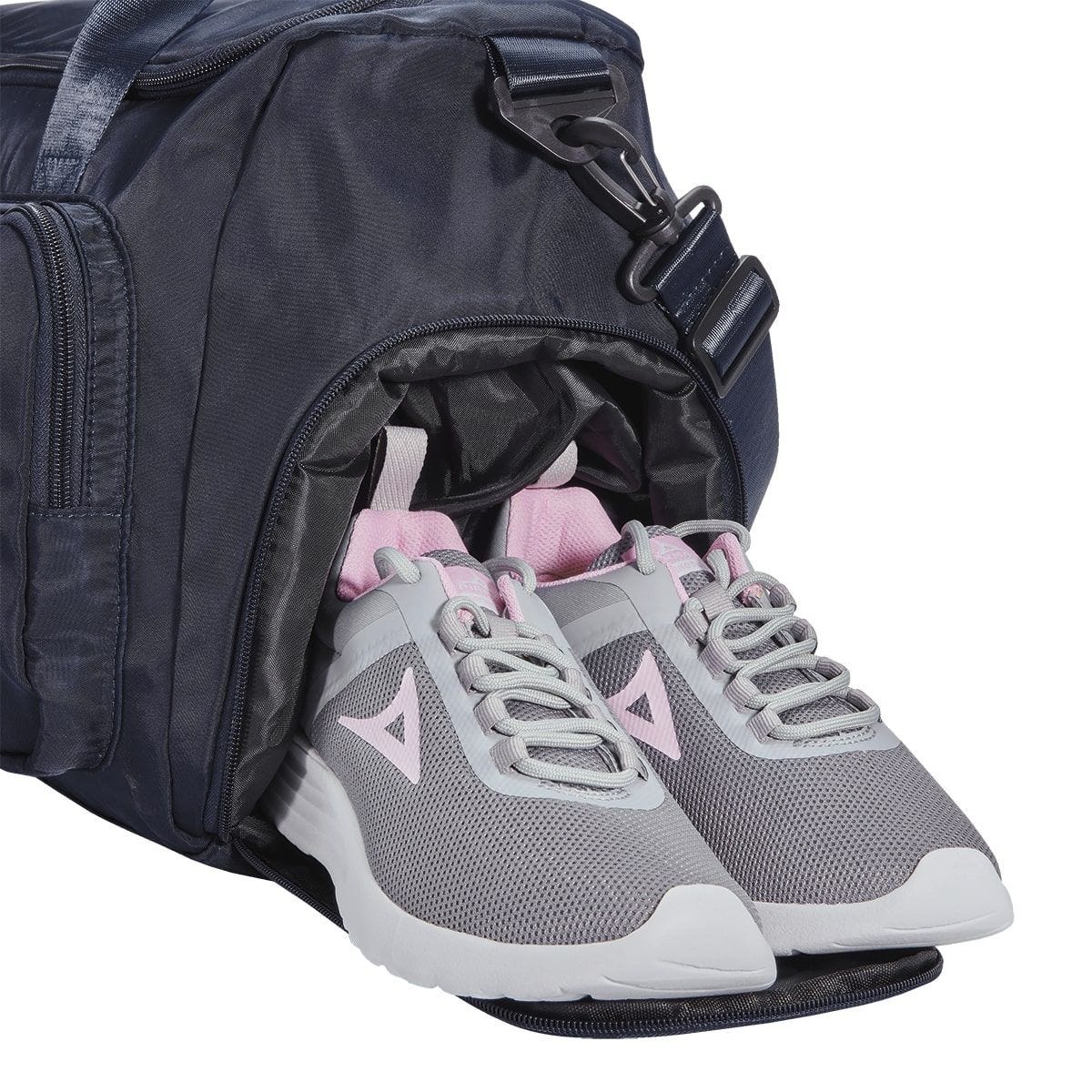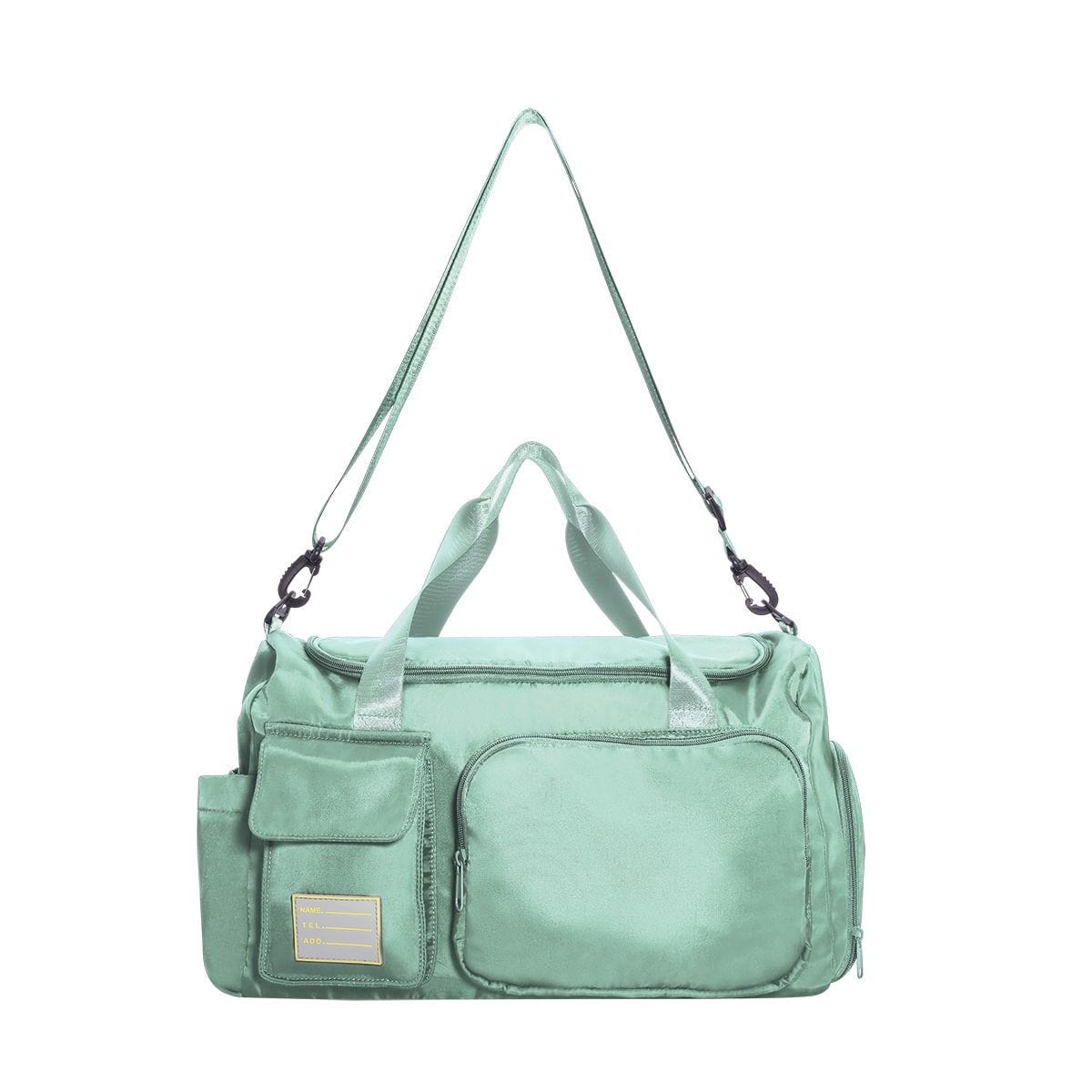Compartimento principal con cierre, bolsillo interior resistente agua; bolsillo lateral izquierdo con cierre de velcro y compartimento derecho con cierre para calzado; doble bolsa frontal con detalle de silicón. Incluye asa ajustable con broche removible y aditamento trasero para sujetar en trolley.