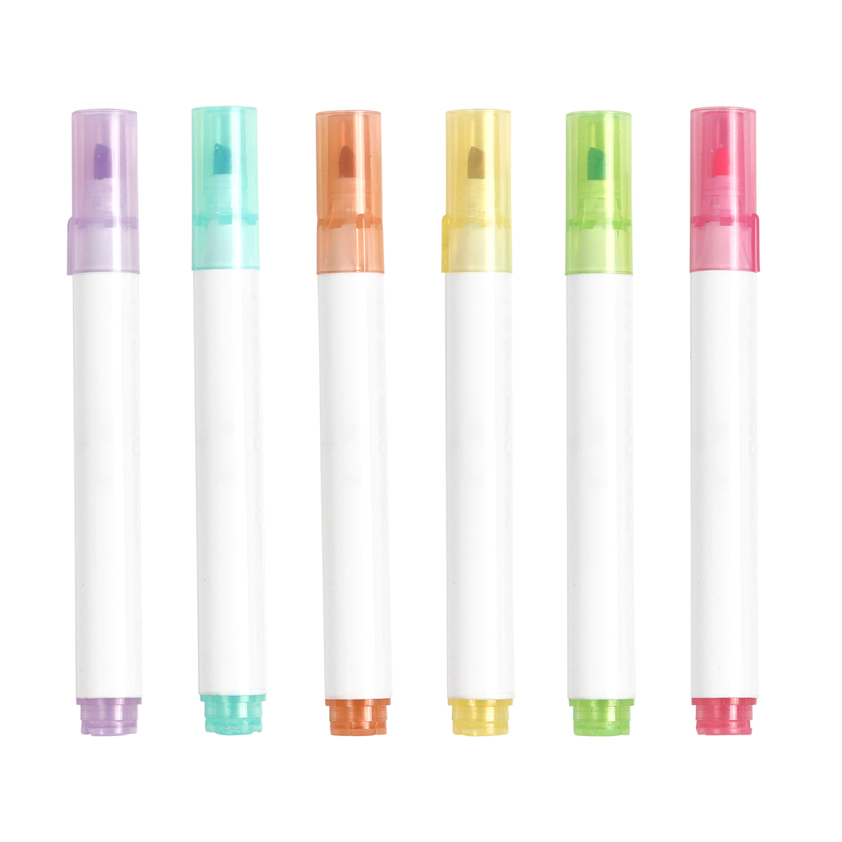 Marcador de texto en tonos vivos, con cuerpo blanco con detalles traslucidos del color de la tinta en tapa y tapón. Ideal para la oficina o el colegio.