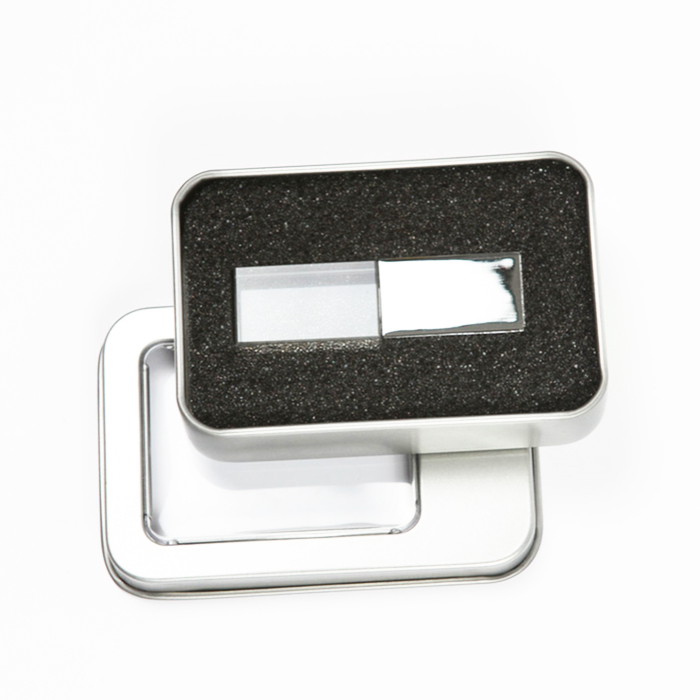 Memoria USB 16 GB de cristal cuadrada con tapa metálica y luz led color azul, en estuche metálico con ventana.