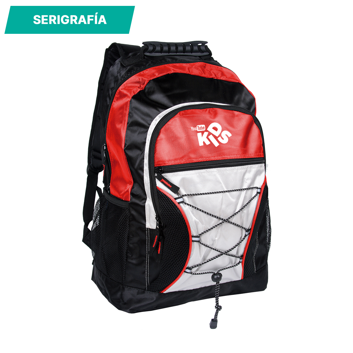 Mochila tipo backpack fabricada en PVC con bolsa de red a un costado.