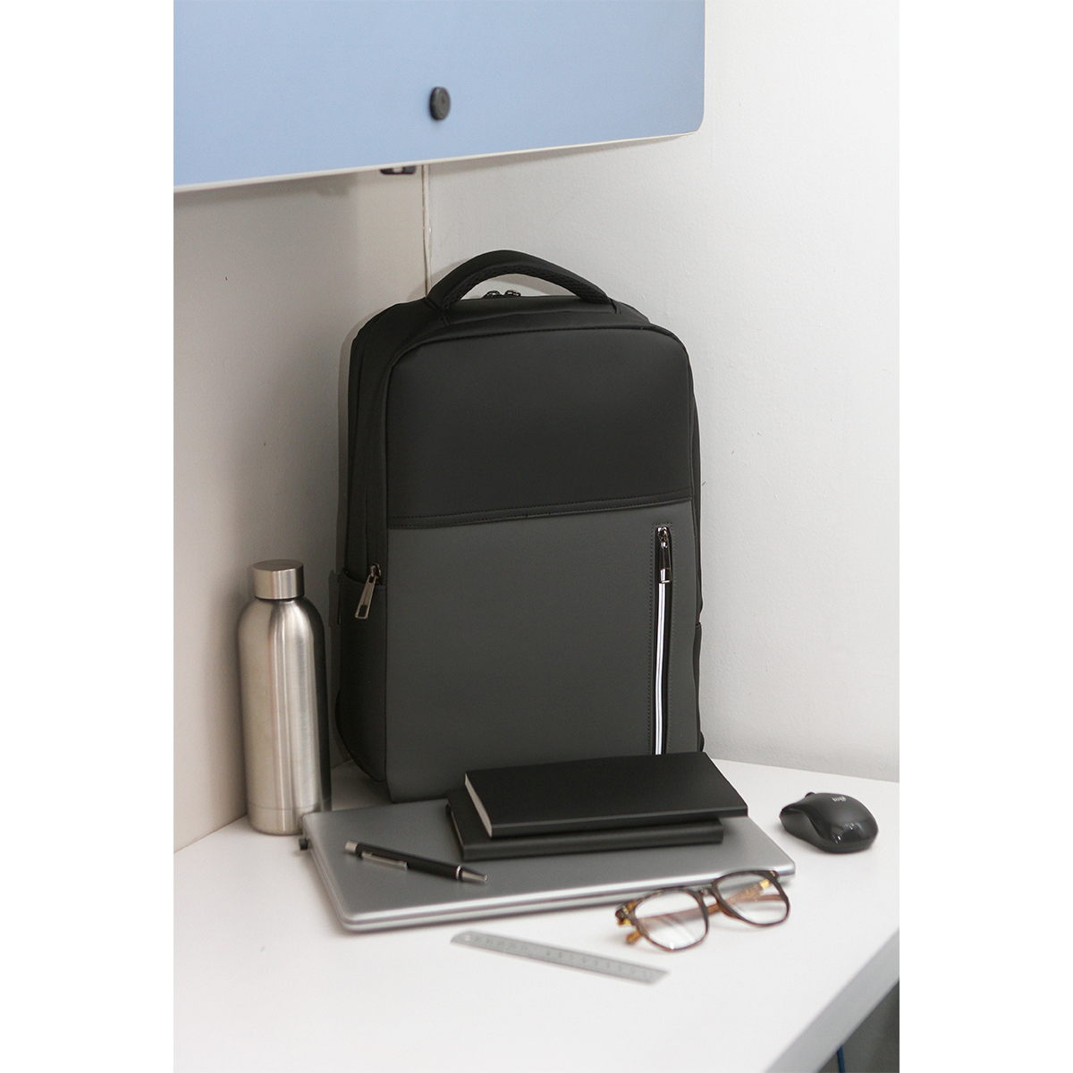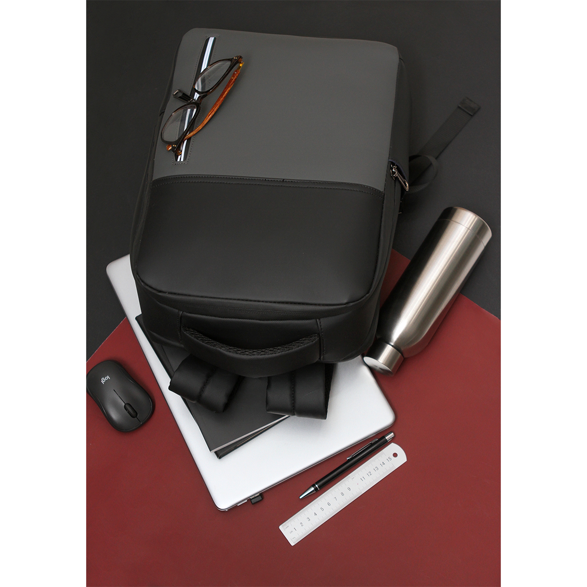 Mochila fabricada en poliéster 900D. Incluye compartimento principal y dos secundarios. Diseño ajustable con correas y asa acolchadas.