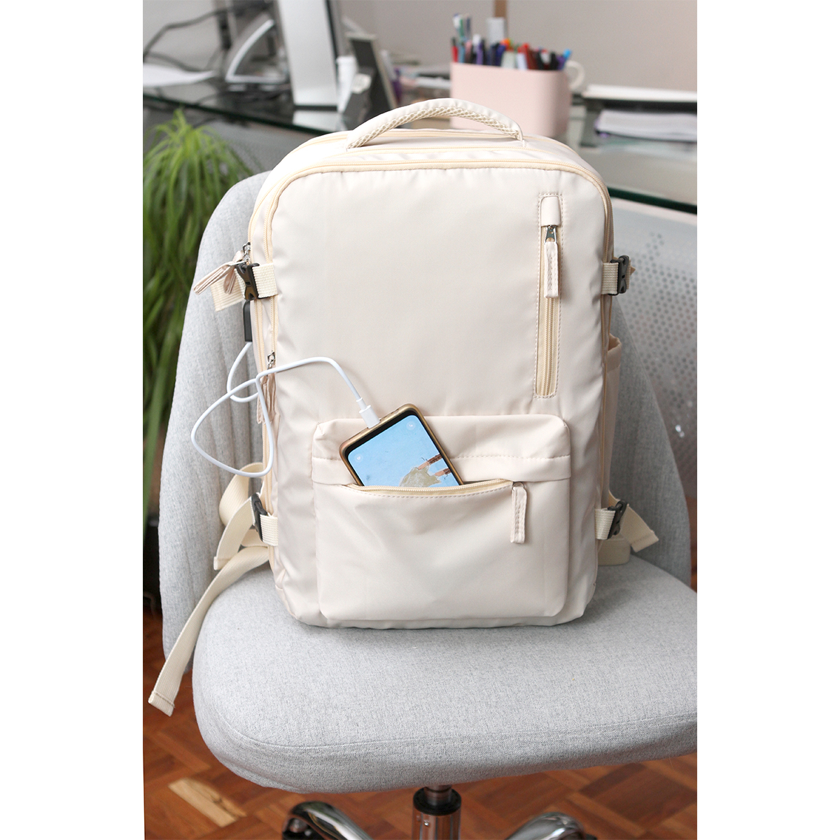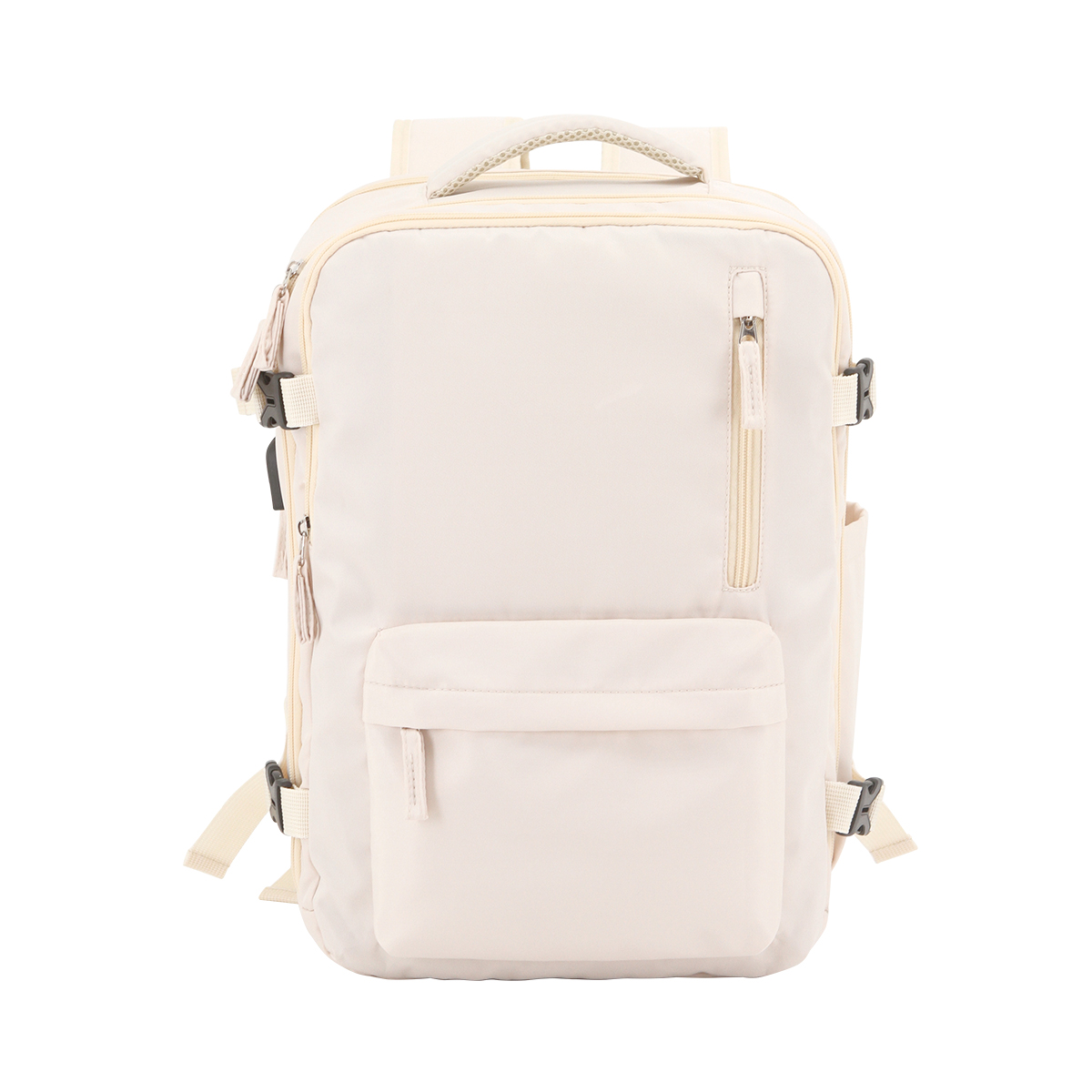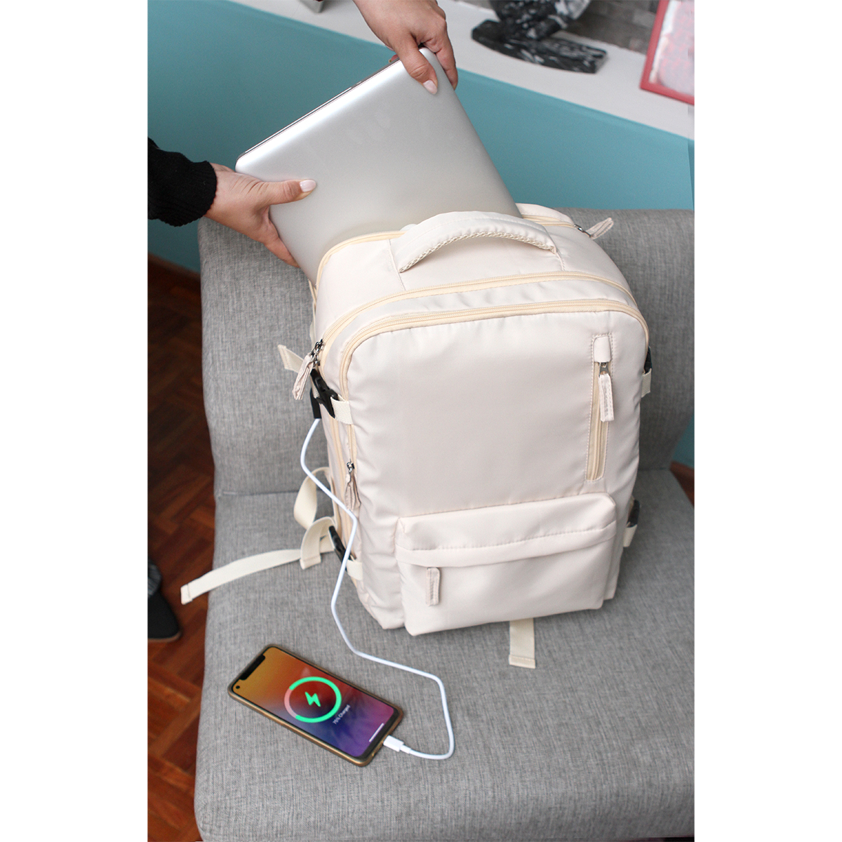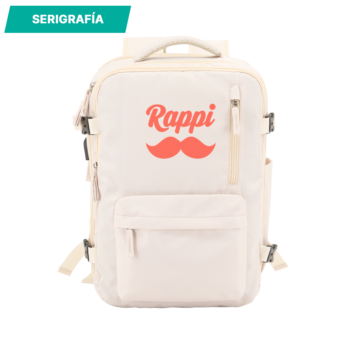 Mochila fabricada en 290D poliéster, salida de cable para cargar dispositivos, cuatro compartimentos ideal para laptop y correas ajustables.
