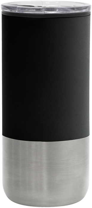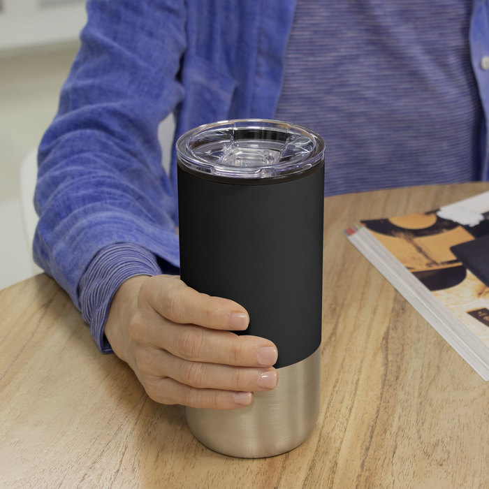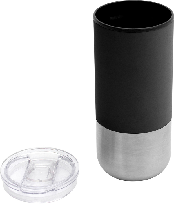 Ø 8 cm X 17.6 cm. Capacidad 500 ml. Polipropileno y acero inoxidable. Mug doble pared. Interior en plástico y exterior de acero inoxidable 201. Tapa transparente a presión con boquilla y seguro antivuelco. Base antideslizante. Presentación en caja de regalo.