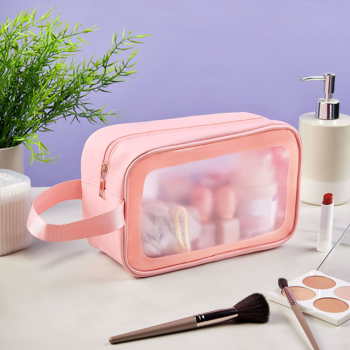 Práctico neceser de viaje impermeable. Ayuda a mantener organizados los accesorios o cosméticos gracias a su compartimento principal con cierre. Hecho de material PVC, el cual protege sus pertenencias de derrames, polvo o rasguños. Incluye asa lateral para su fácil trasportación.