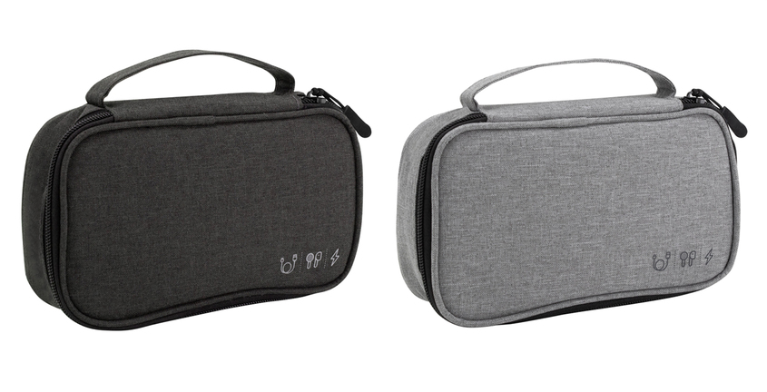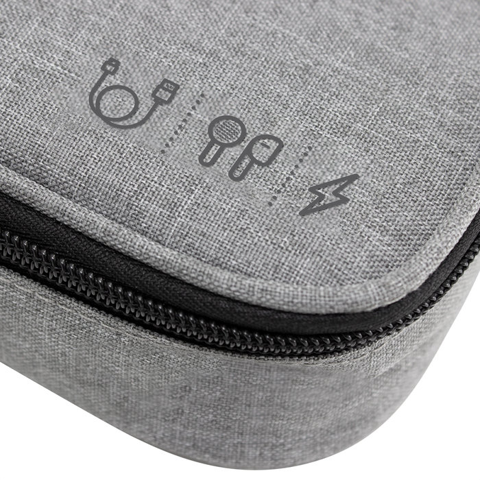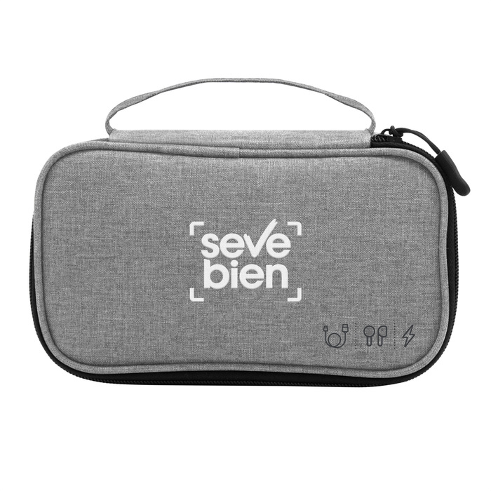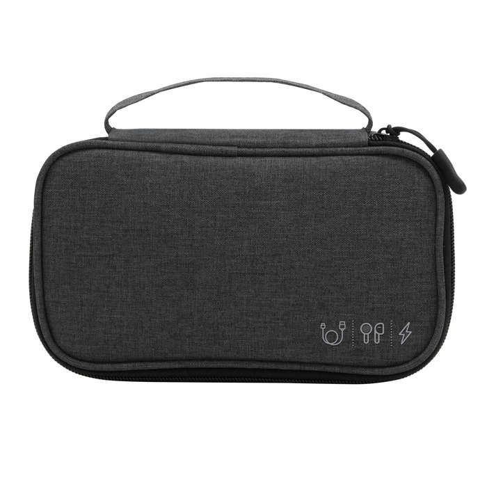 20 x 12 x 5,3 cm. Poliéster 300D. Organizador de cables. Estructura acolchada. Asa para transportar. Compartimento principal con cierre con tirador engomado. Interior forrado. En uno de sus lados cuenta con un bolsillo principal y dos pequeños de red, y en el lado contrario tiene un elástico con velcro multipropósito.