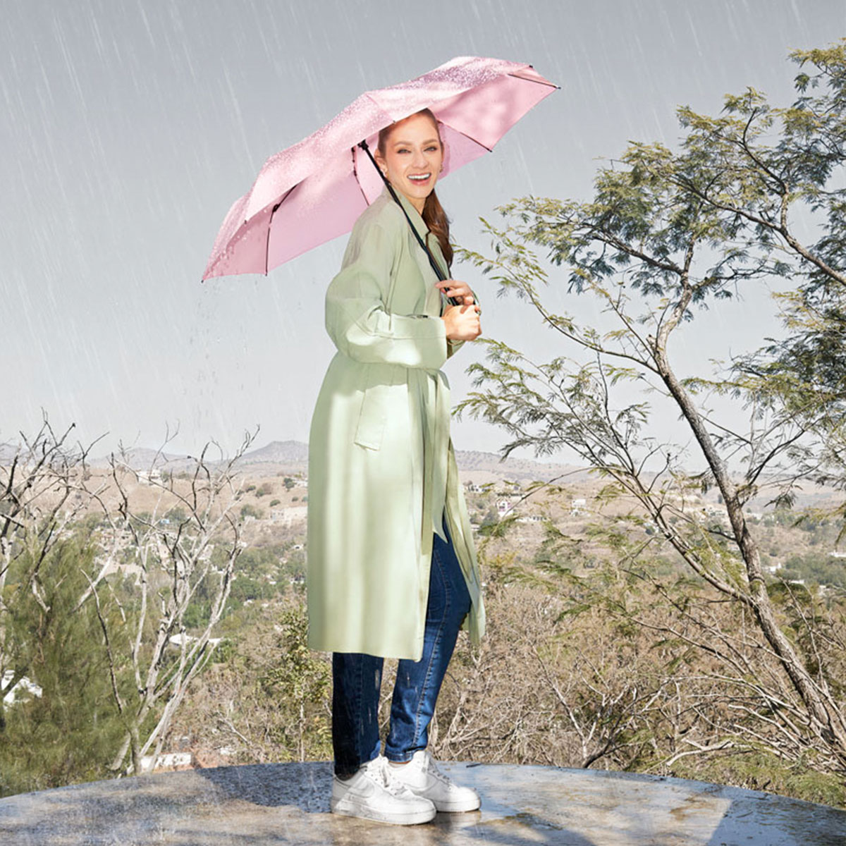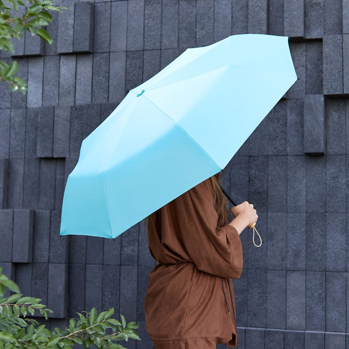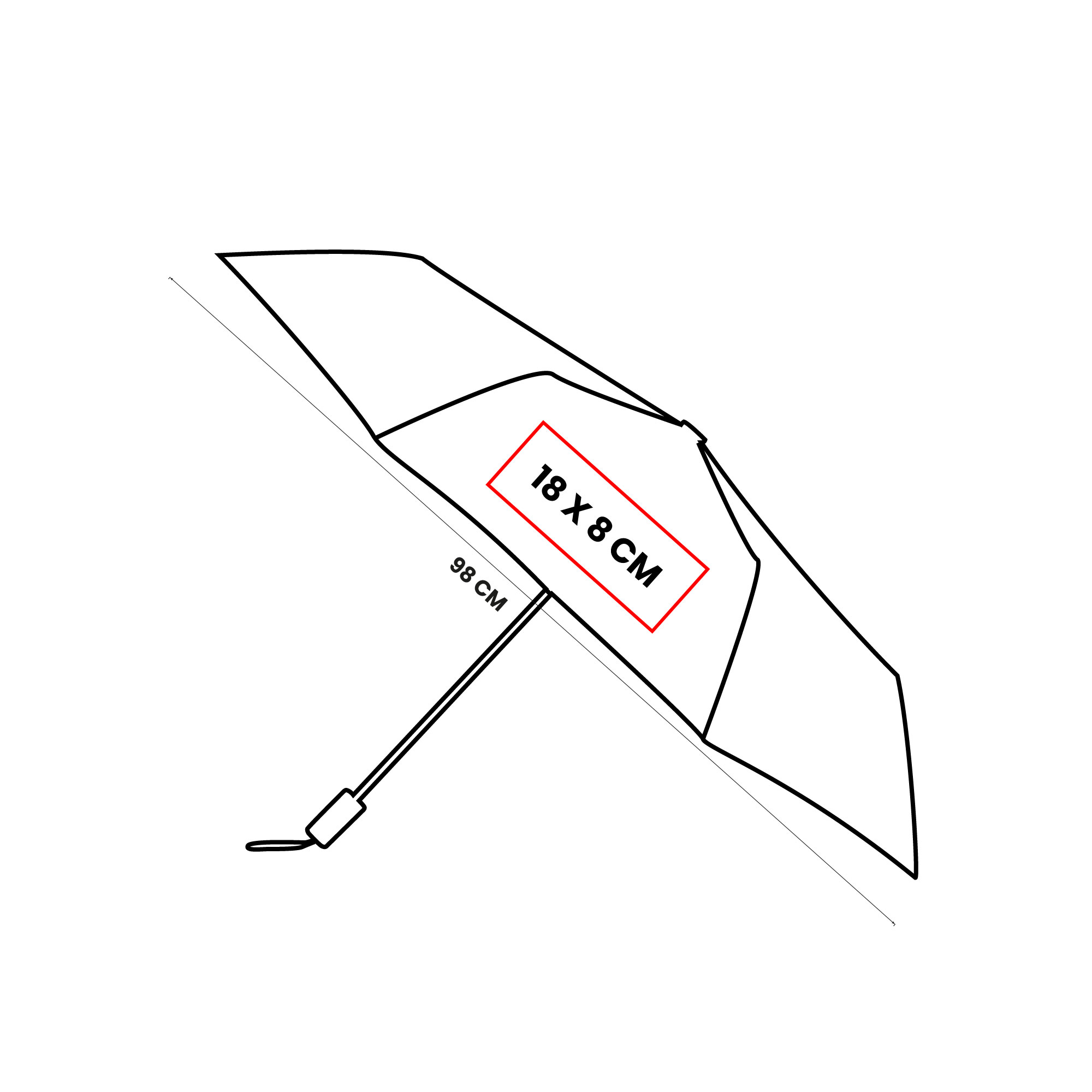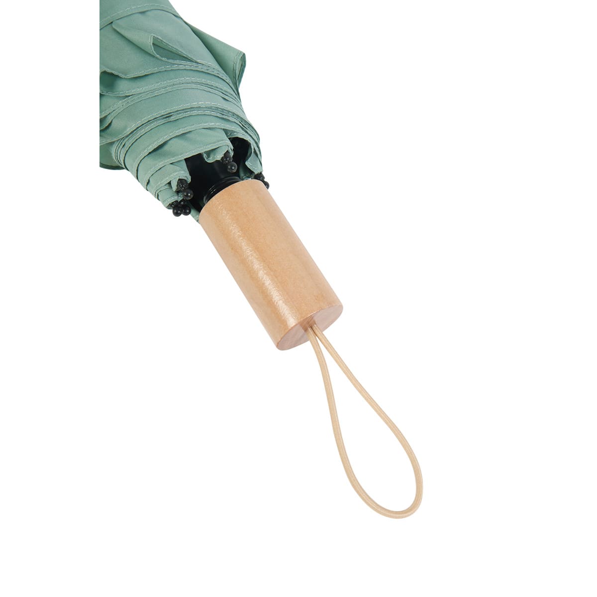 Paraguas de bolsillo de 8 paneles. Sistema de abertura manual. Mango de madera con asa elástica. Incluye funda individual con botón metálico que permite abrir para volver a guardar el paraguas fácilmente.