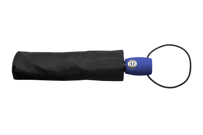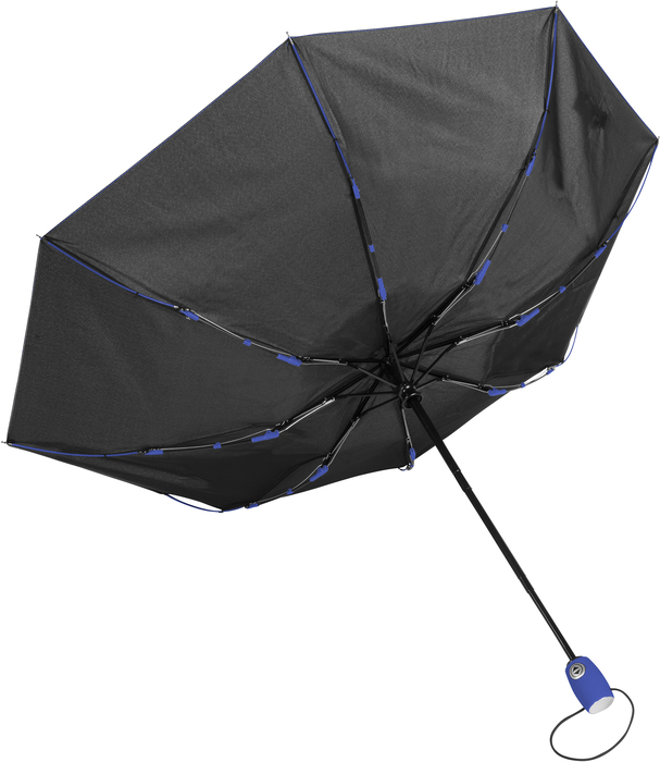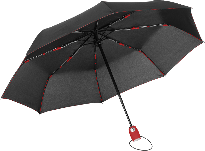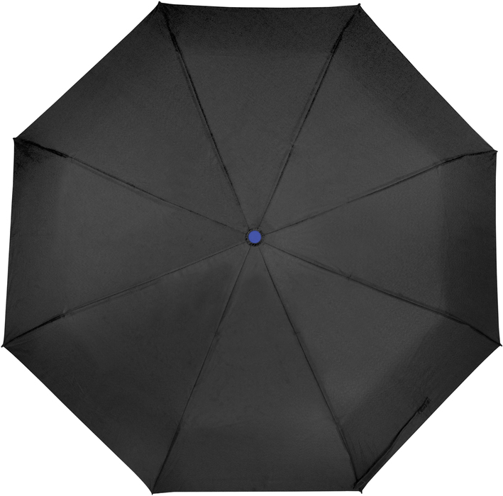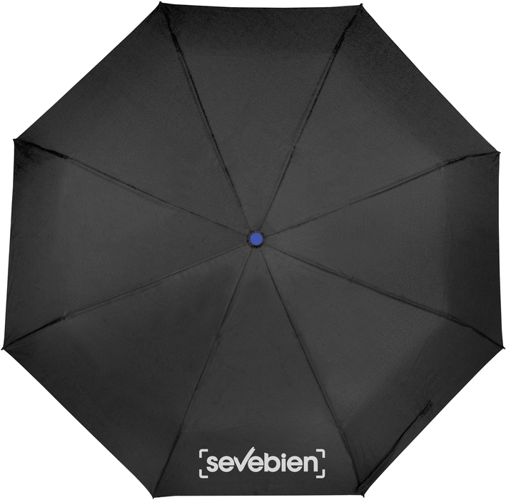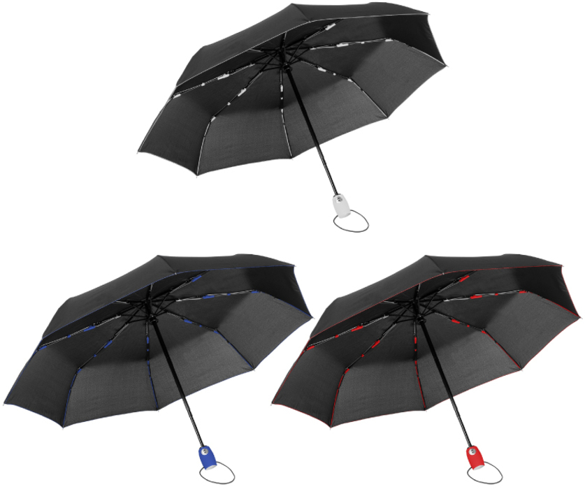 Ø 98 cm. 8 gajos. Ancho gajo 37 cm. Largo cerrado 27 cm. Largo abierto 54 cm. Poliéster, metal y plástico engomado. Paraguas APERTURA Y CIERRE AUTOMÁTICO con sistema antiviento. Eje metálico y varillas de fibra de vidrio con detalles en color. Mango plástico engomado de color con cordón elástico color negro. Botón a presión. Cubierta y funda de poliéster con costura de color. Cierre con correa de velcro.