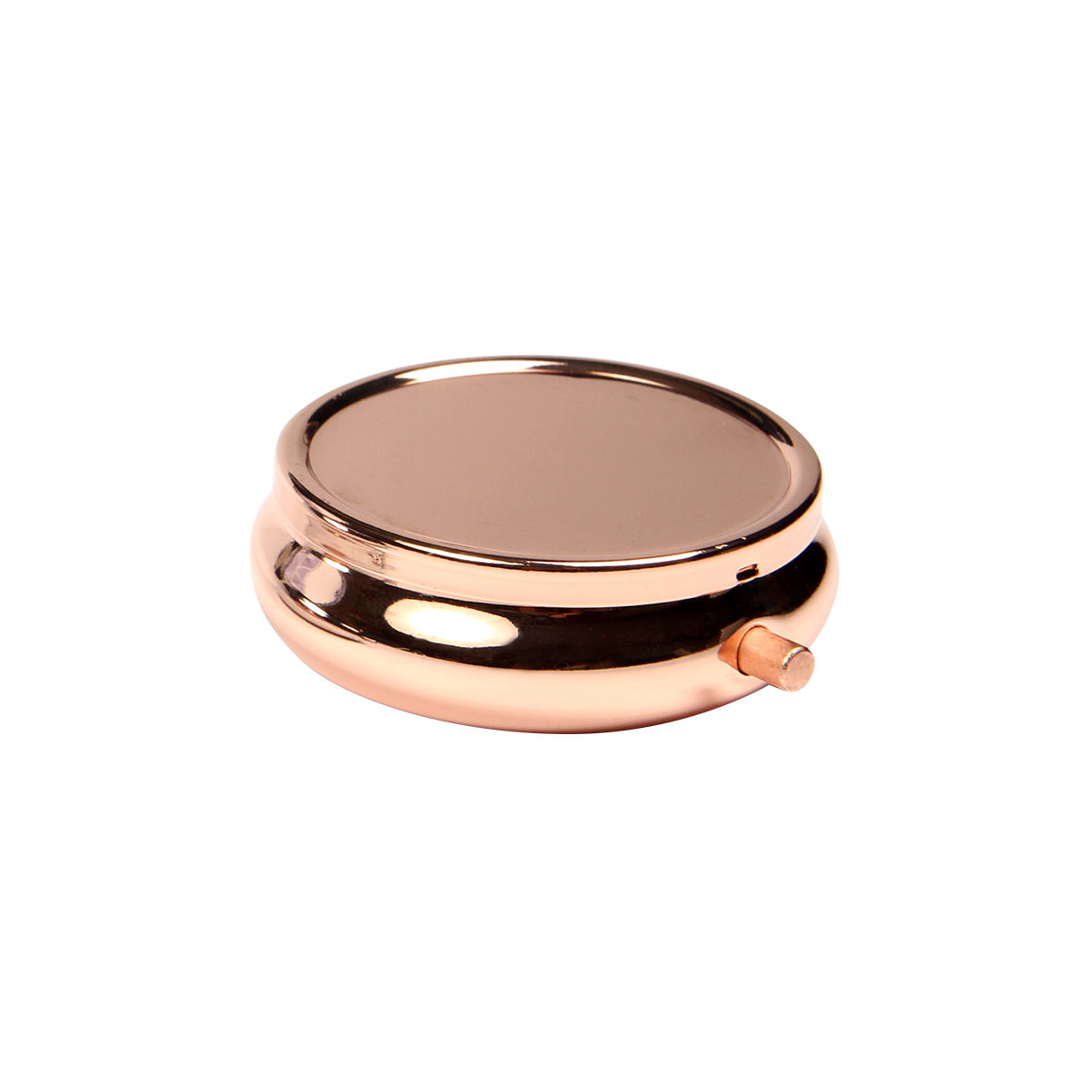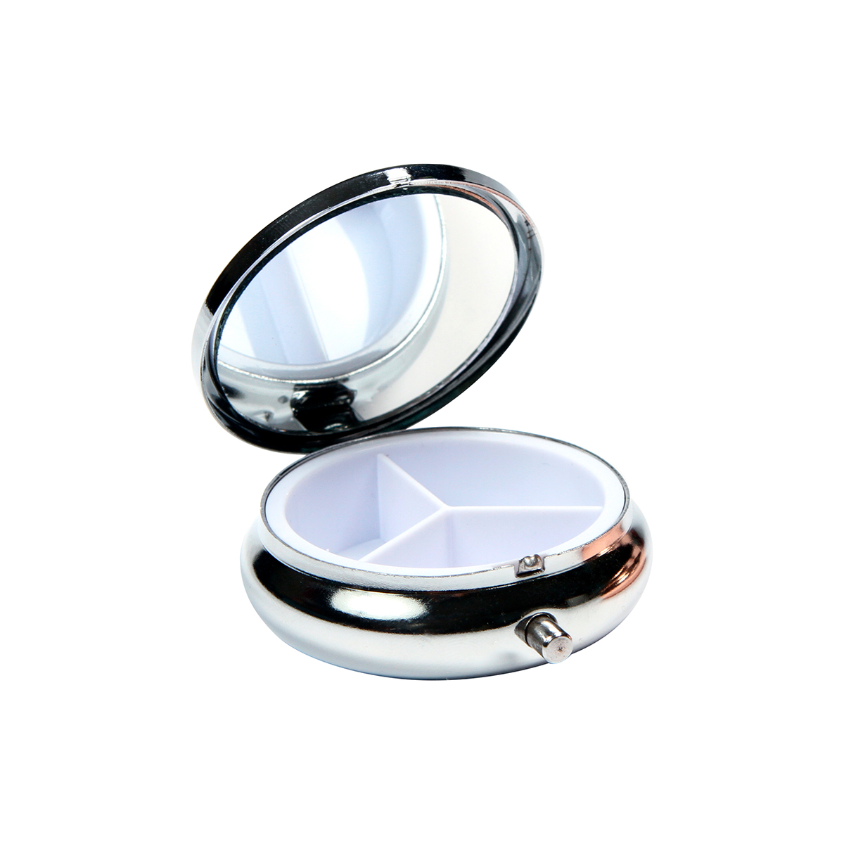Pastillero con espejo, fabricado en metal y plástico ABS, con tres compartimentos.