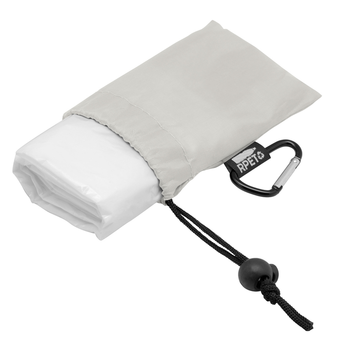 127 x 100 cm. Polietileno. Poncho impermeable. Presentación en bolsa de RPET de diferentes colores con cierre ajustable y mosquetón de aluminio color negro.
