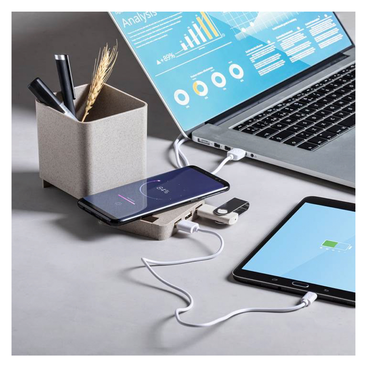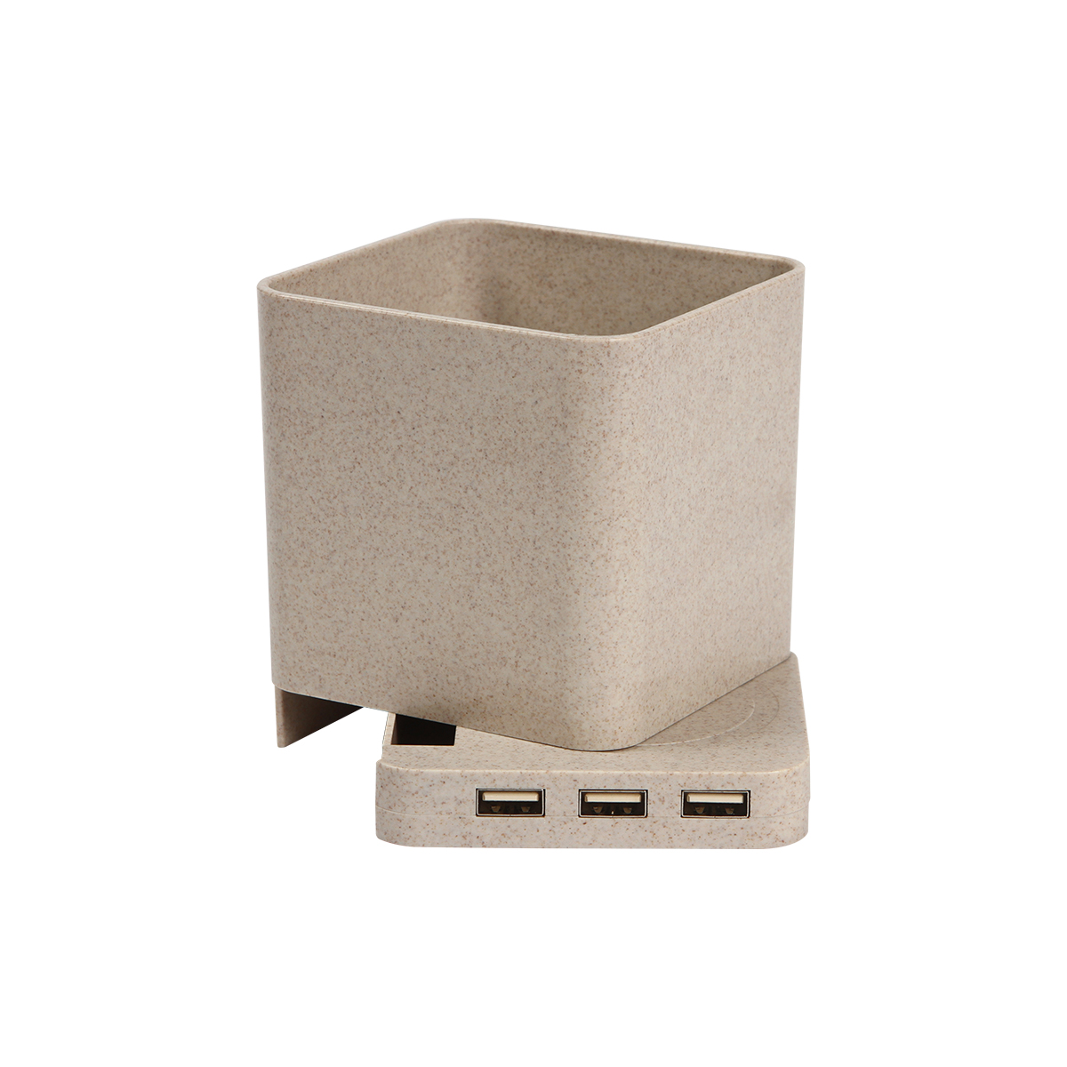 Porta lápices fabricado en fibra de trigo y plástico ABS, con cargador inalámbrico para dispositivos móviles de 5W y 3 salidas USB, de tamaño compacto lo que lo hace fácil de transportar. Carga a través de cable USB (incluido). Incluye caja de cartón individual.