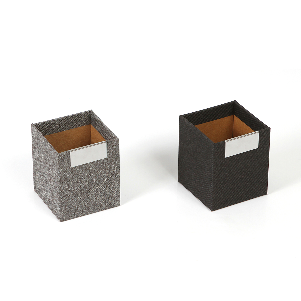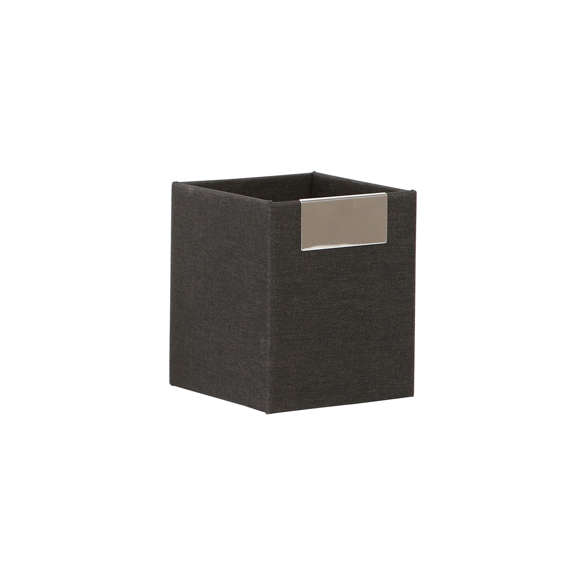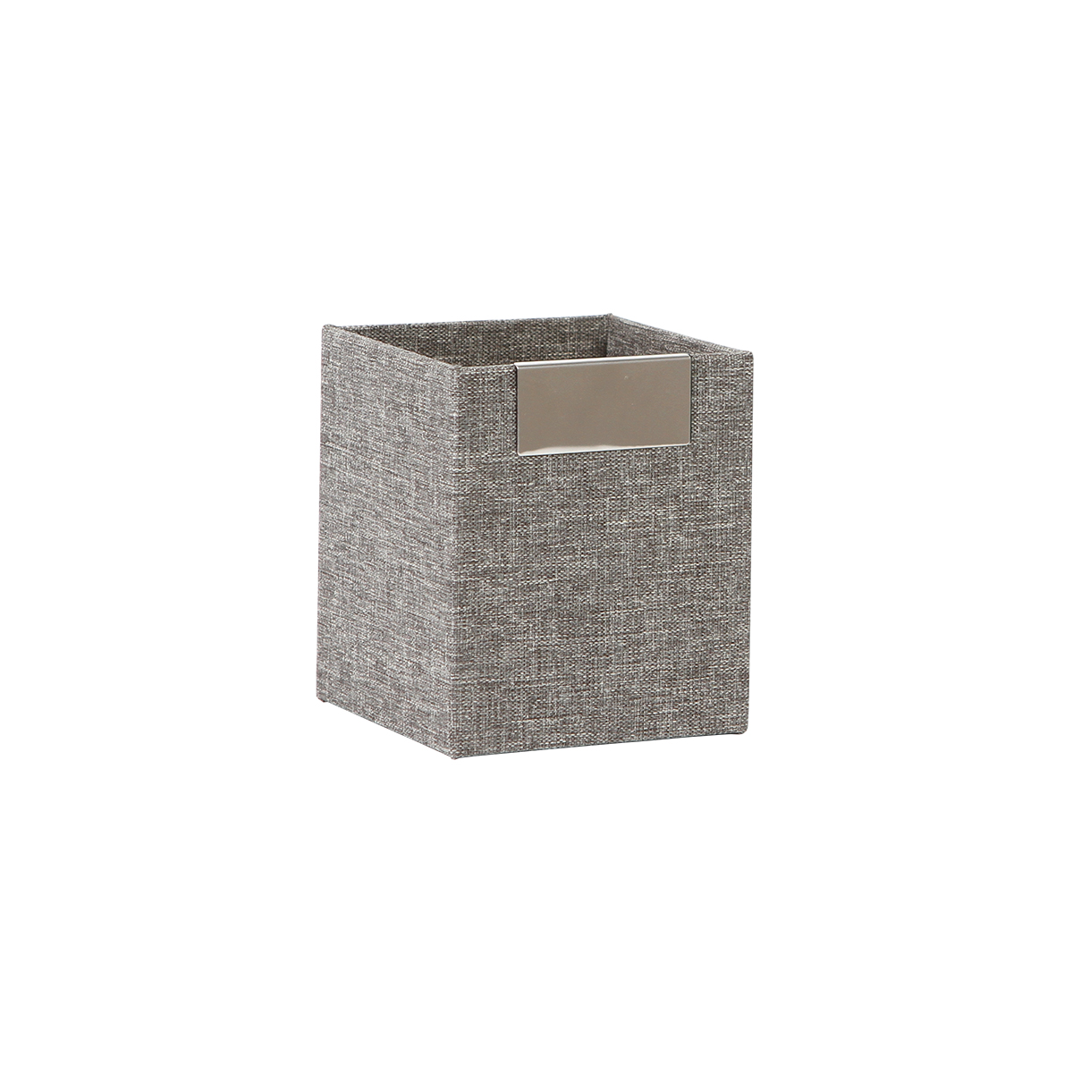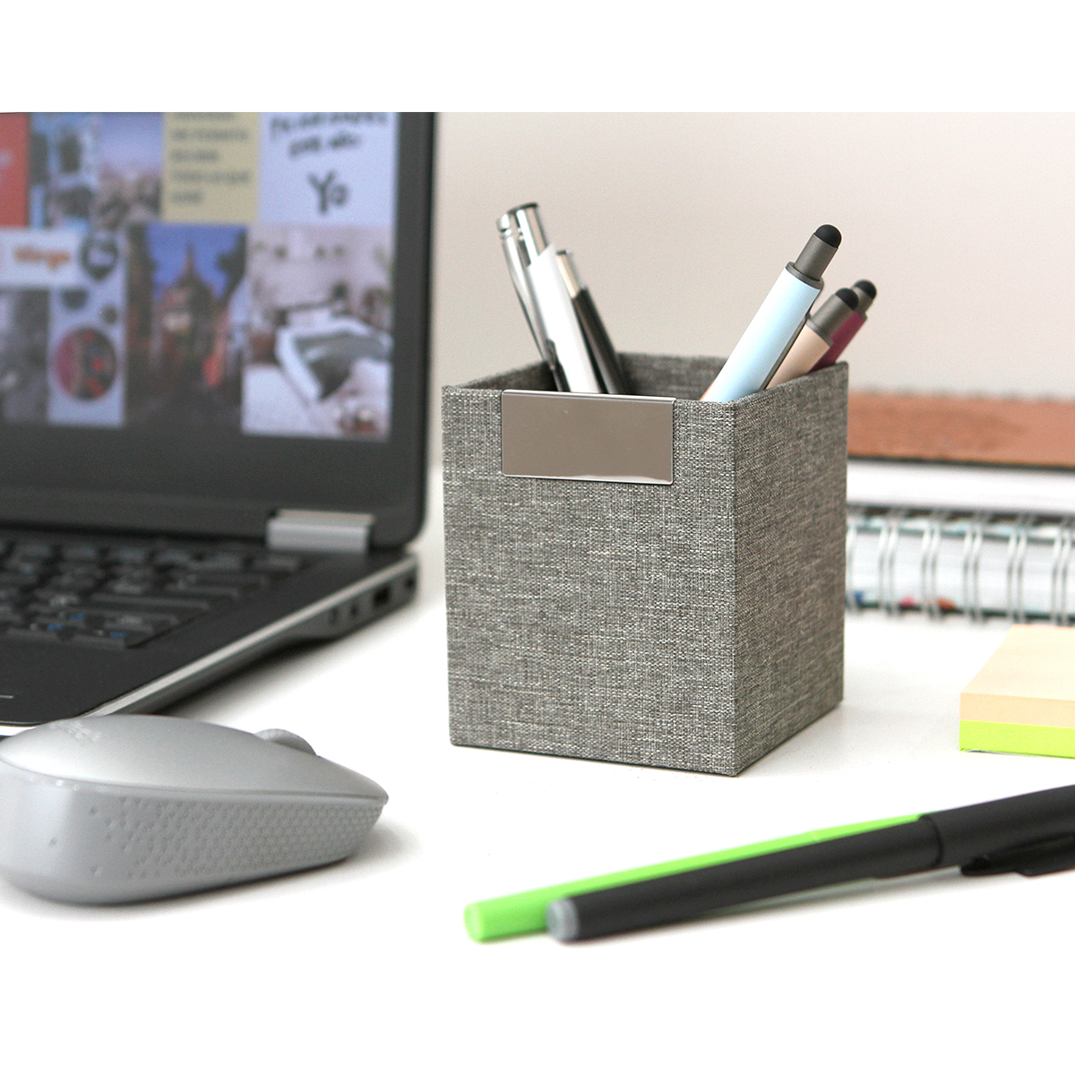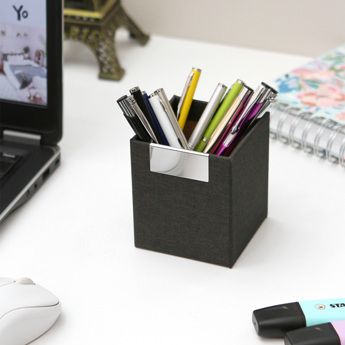 Portalápices de diseño cuadrado fabricado en material RPET 300D, con detalles cromados.