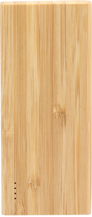 12 x 5,2 x 1,4 cm. Capacidad 5000 mAh. Bambú. Power bank. Batería portátil con 1 puerto de entrada micro + 1 tipo C y 1 puerto de salida USB. Entrada y salida: 5V/2A. Indicador de potencia de 4 leds. Cable de carga USB tipo C de 30cm de largo en color blanco. Tiene múltiples protecciones: de carga y descarga, de sobrecarga y protección de corto circuito. Presentación en caja de regalo kraft.