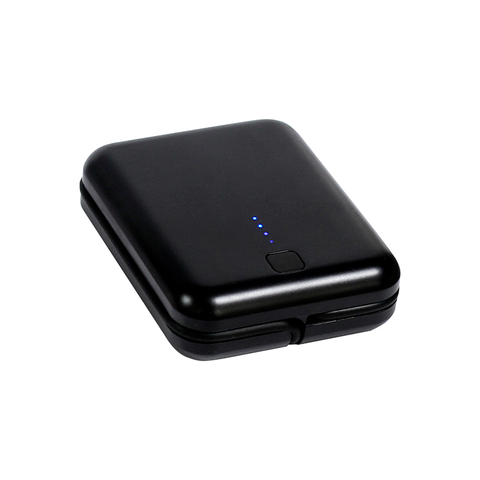 Power bank pocket fabricada en ABS con cable duo para IOS y android, capacidad de 5,200 mAh.