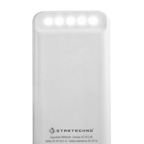 Batería auxiliar para smartphone con linterna LED y función de carga inalámbrica. Capacidad 8,000 mAh, con 4 LEDs indicadores de carga. Cuenta con 2 salidas USB, entrada micro USB y tipo C. Potencia de carga inalámbrica de 5W. Incluye cable cargador compatible con USB y micro USB.