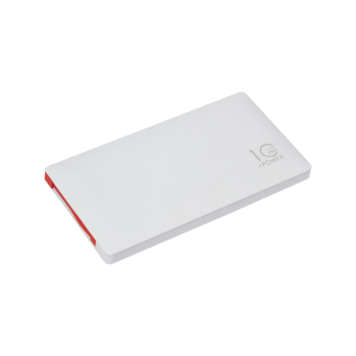Power bank fabricada en plástico ABS con acabado rubber, 2 entradas USB, salida tipo C y micro USB, capacidad de 10,000 mAh.