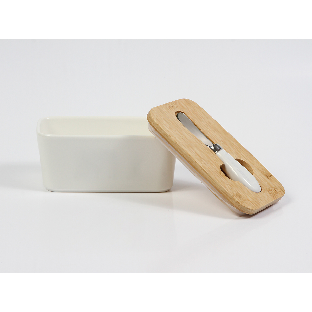 Recipiente para barras de mantequilla fabricado en cerámica y tapa de madera con función hermética y espacio para almacenar el cuchillo. Incluye cuchillo untador. La combinación de la cerámica y madera vuelven este recipiente una opción súper elegante para tu cocina.