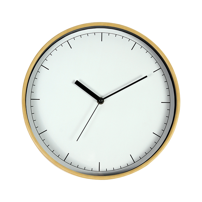 Reloj de pared con arillo de plástico apariencia bambú y protección de cristal. Incluye caja de cartón individual.