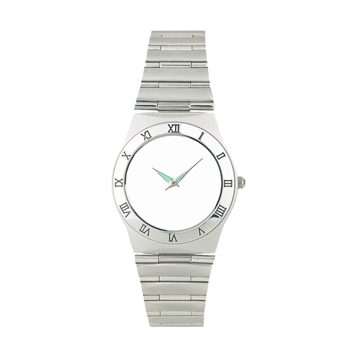 Reloj metálico con números romanos grabados en el bisel y maquinaria metálica japonesa. Incluye estuche metálico individual.