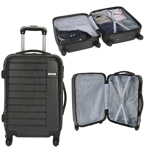 Maleta de plástico para viaje, con ruedas giratorias, asa metálica retráctil y candado de seguridad.