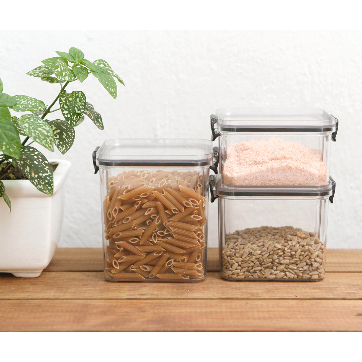 Set de tres contenedores para alimentos, fabricado en PET y polipropileno (PP). Con capacidades de 460 ml, 700 ml y 950 ml. Diseño especial para conservar y transportar alimentos.