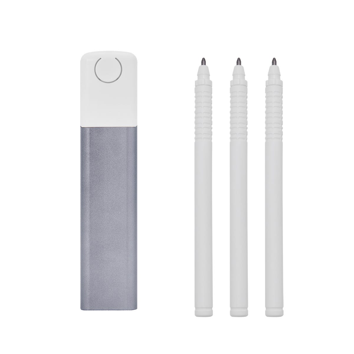 Set de 3 bolígrafos de tinta negra, azul y roja. Incluye estuche de plástico con sistema push. La base del bolígrafo indica la tinta con el color correspondiente.