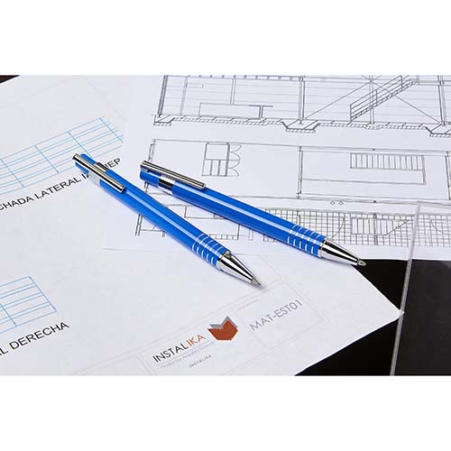 Bolígrafo y lapicera 0.5 mm. Mecanismo pulsador. Incluye estuche metálico.