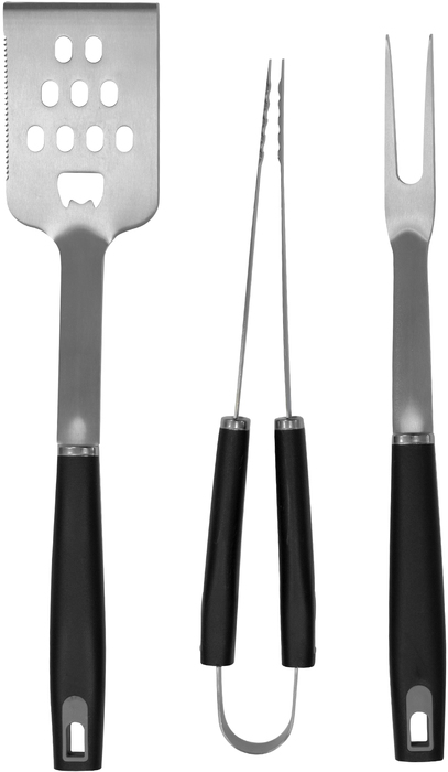 46,5 x 12 x 4,5 cm cerrado. Acero inoxidable y polipropileno + Poliéster. Set de asado en estuche color negro con cierre. Contiene 3 utensilios de acero inoxidable 420: tenedor de 135g y 41 cm de largo; pinza de 275g y 39 cm de largo; y espátula de 225g y 43 cm de largo, todos con mango de polipropileno en color negro. Espátula multipropósito (recoge, escurre, corta y destapa). Calidad premium. Estuche con cierre.