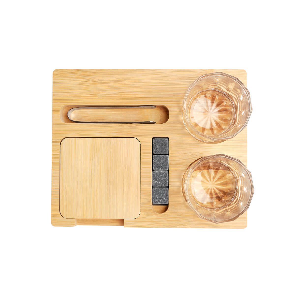 Set de bar con base de bambú. Incluye 2 vasos de cristal para whisky, 4 cubos enfriadores de granito , 2 portavasos de bambú y pinzas para hielo de acero inoxidable. Incluye caja individual.