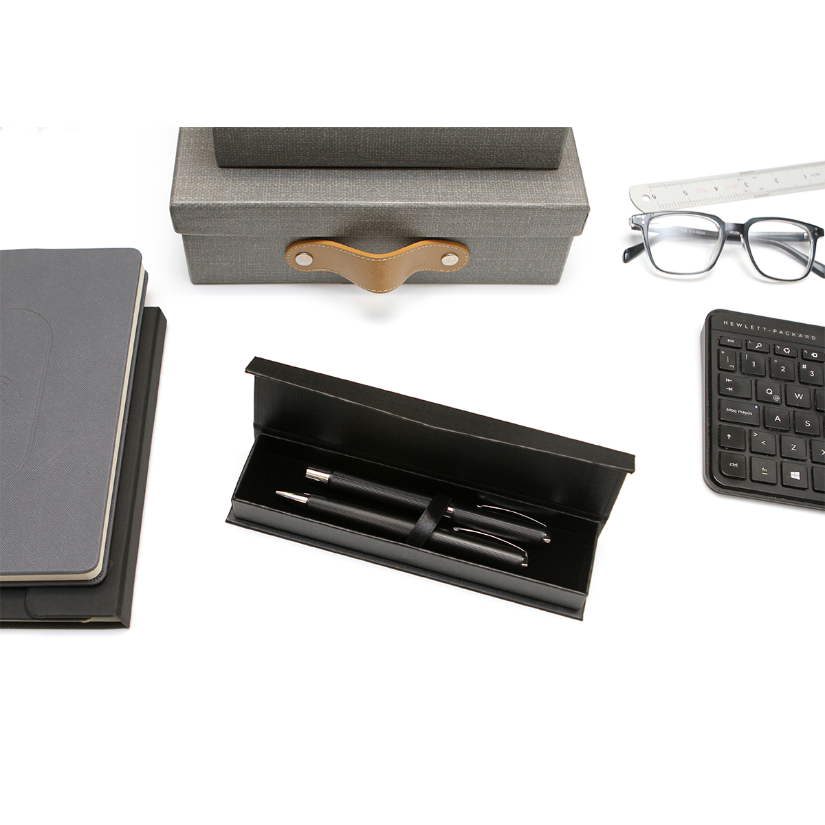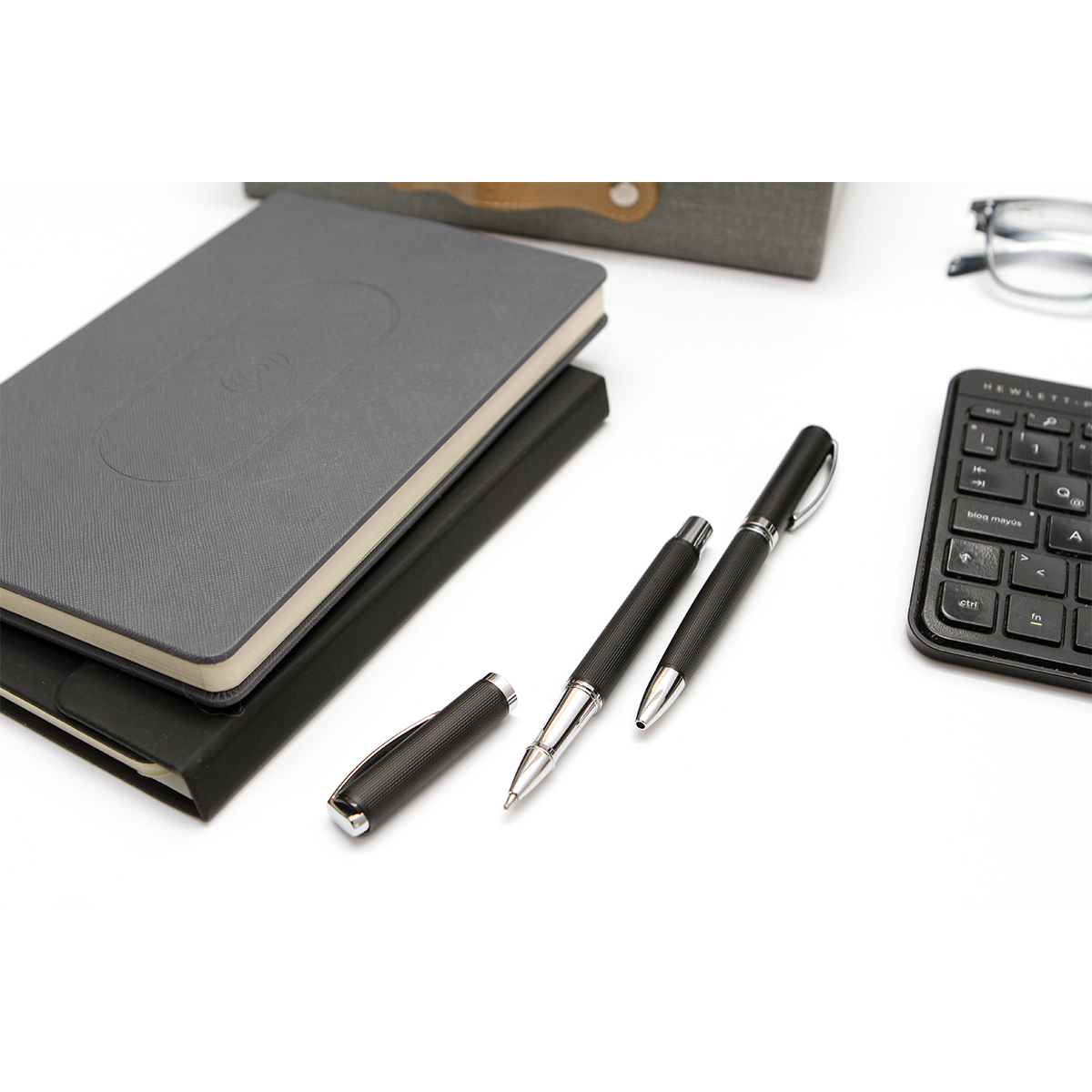 Este Set de bolígrafos incluye una ball pen y un roller pen, ambos fabricados en metal, lo que les confiere durabilidad y un aspecto sofisticado, presentan detalles cromados en la punta y el clip, lo que agrega un toque de elegancia y distinción, utilizan tinta de escritura negra e incluyen un estuche especialmente diseñado para proteger y almacenar los bolígrafos de forma segura.