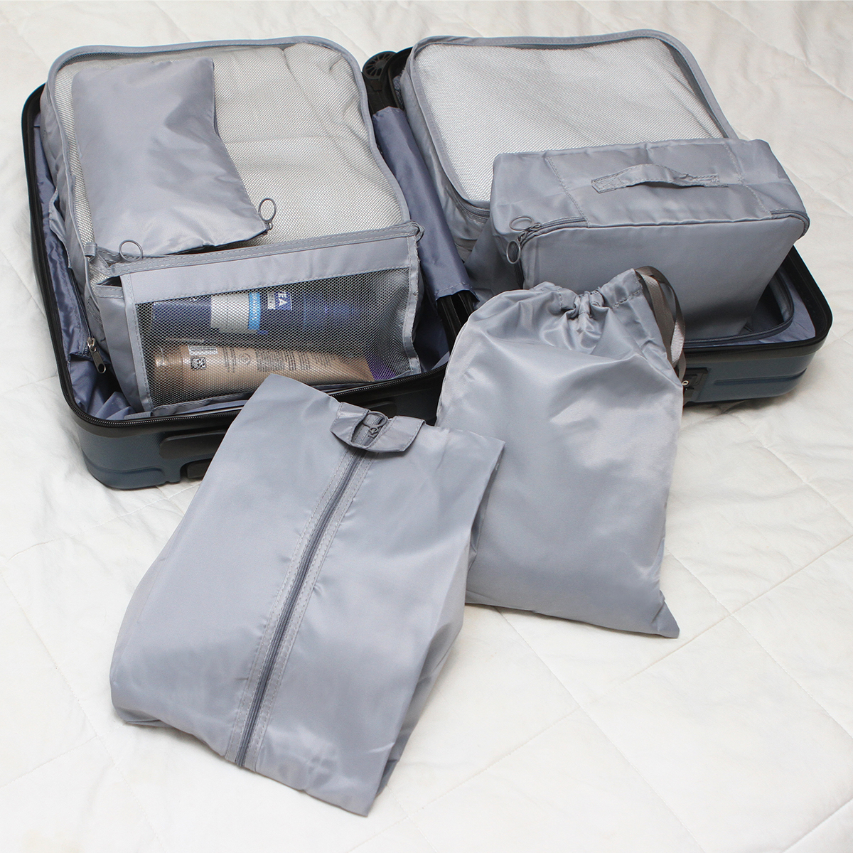 Set de 8 bolsos organizadores de equipaje, fabricados en poliéster de alta calidad, es duradero y tiene una textura suave, incluye 3 bolsos para lavandería en 3 medidas diferentes, bolso para ropa interior, para calzado, artículos de aseo personal, para cosméticos y bolsa multiusos con jareta, este articulo es tu compañero perfecto para viajar, acampar, separa ropa de gimnasio o ir a la playa. Creadas con tela de revestimiento son impermeables y enmalladas en poliéster, altamente resistente, repele el agua, a prueba de polvo y transpirable, evita el crecimiento de bacterias, reduce olores, organiza el espacio de tu equipaje de una manera razonable sin líos haciendo espacio suficiente para todo.