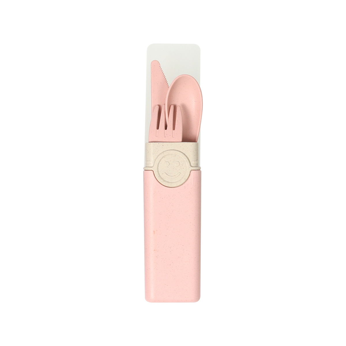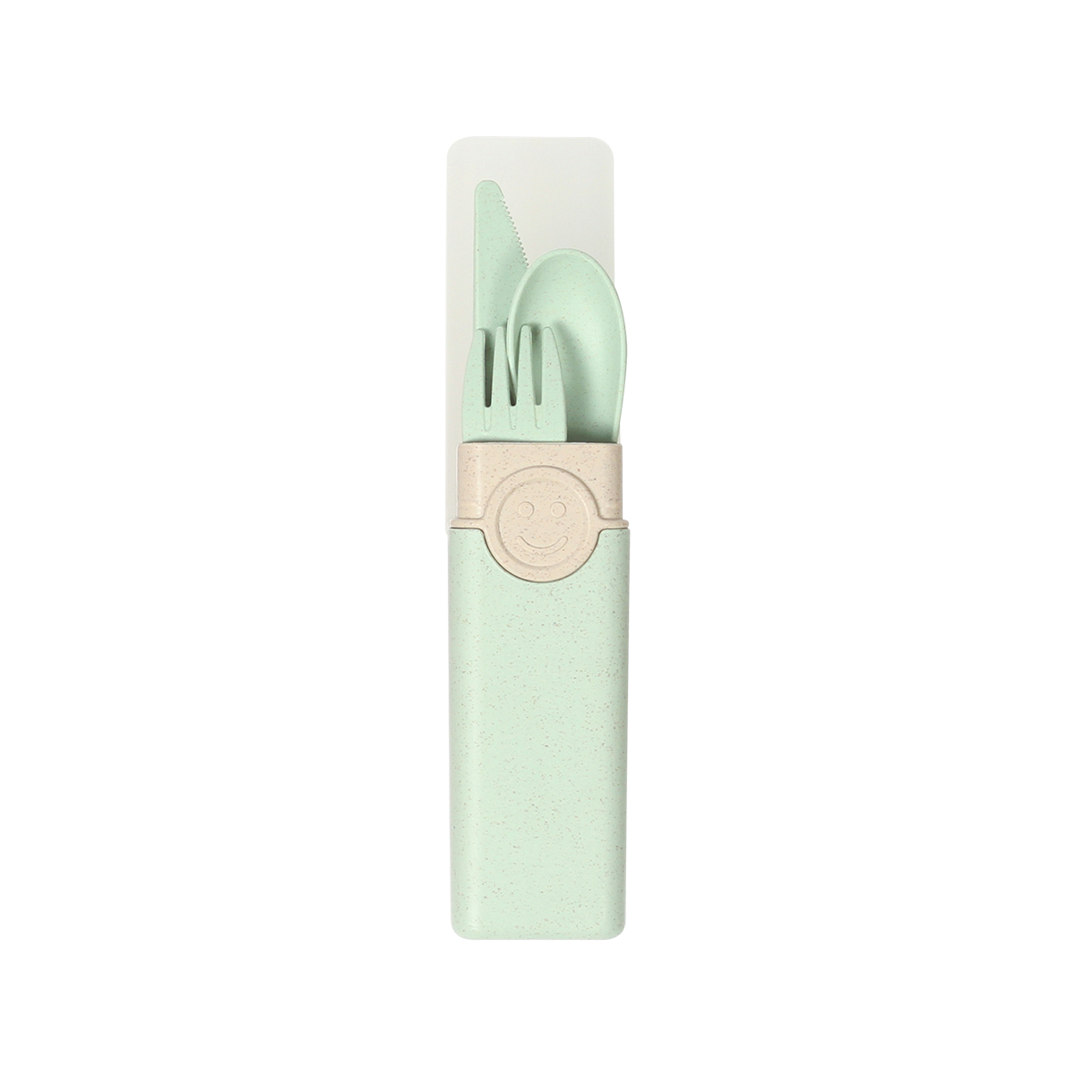 Set de cubiertos fabricado en fibra de trigo y polipropileno (PP), ofrece durabilidad y resistencia para un uso prolongado, incluye tres piezas de cubiertos: cuchillo, tenedor y cuchara. La combinación de fibra de trigo y polipropileno garantiza una textura suave. El set viene con un estuche grabado vertical con una cara feliz.