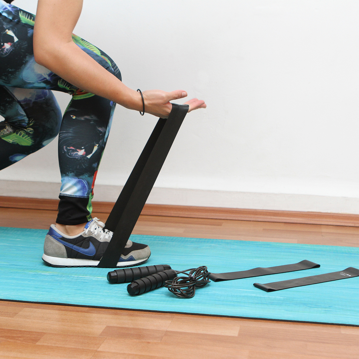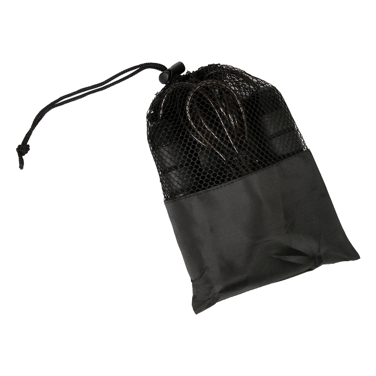 Set fitness con 1 banda elástica de 30×5 cm y 1 cuerda de 3 m; ambas fabricadas en caucho. Incluye bolso de malla con cordón y broche de seguridad. Ideal para llevarlo contigo siempre por su practico tamaño.