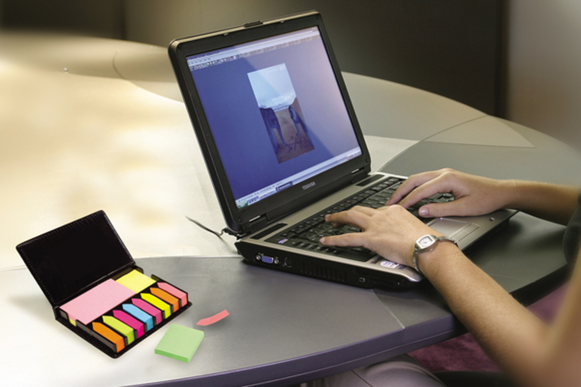 12,6 x 2,8 x 10,5 cm. Curpiel negra. 8 Blocs autoadhesivos de diferente color en forma de flecha. 2 Blocs autoadhesivos rectangulares de diferente color. 2 Blocs autodhesivos cuadrados de diferente color.