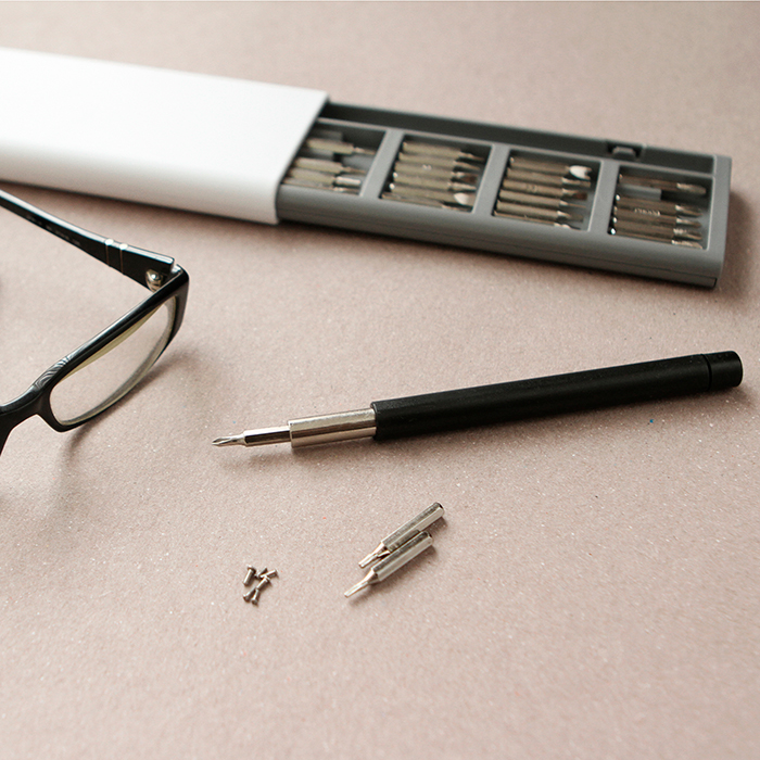 Set de plástico color blanco con 24 puntas de desarmador intercambiables y mango adaptador.
