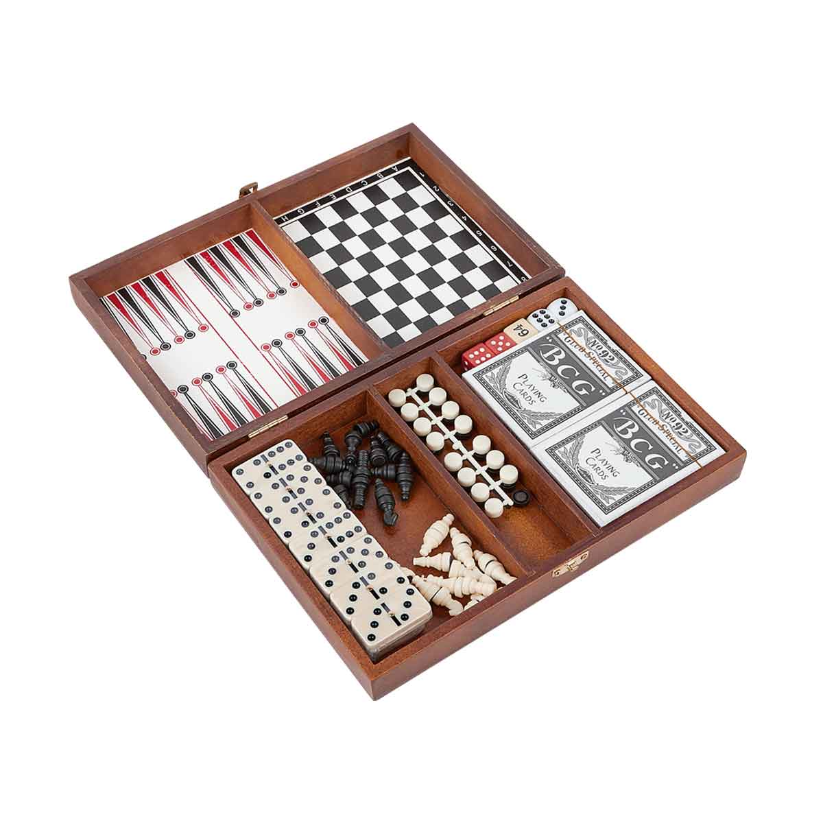 Incluye estuche de madera con juego de ajedrez, backgammon, 2 barajas plastificadas y dominó de 28 piezas.