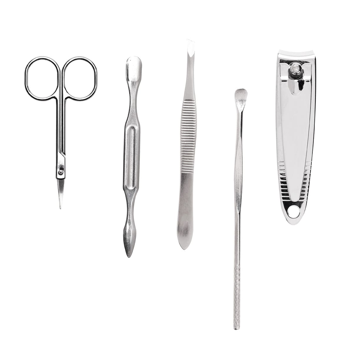 Sobre de curpiel con botón metálico. Incluye 6 piezas para un manicure básico. 1 cortauñas, 1 tijeras curva para uñas, 1 lima de uñas, 1 empujador de cutícula, 1 limpia uñas y 1 pinza para cejas.