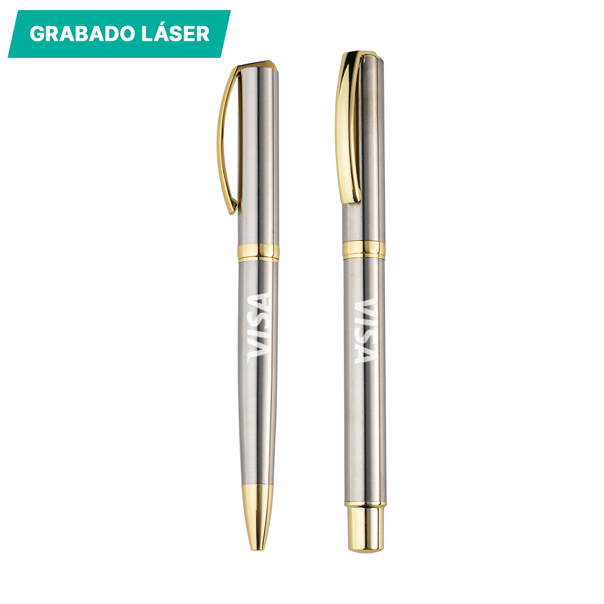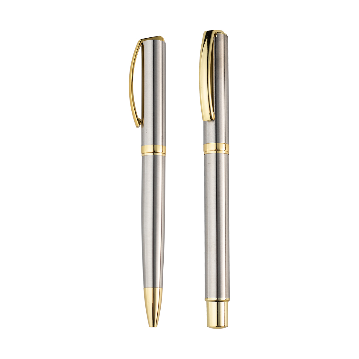 Set de ball y roller pen fabricadas en latón, con detalles dorados en clip y punta, tinta de escritura azul. Incluye caja de cartón individual.