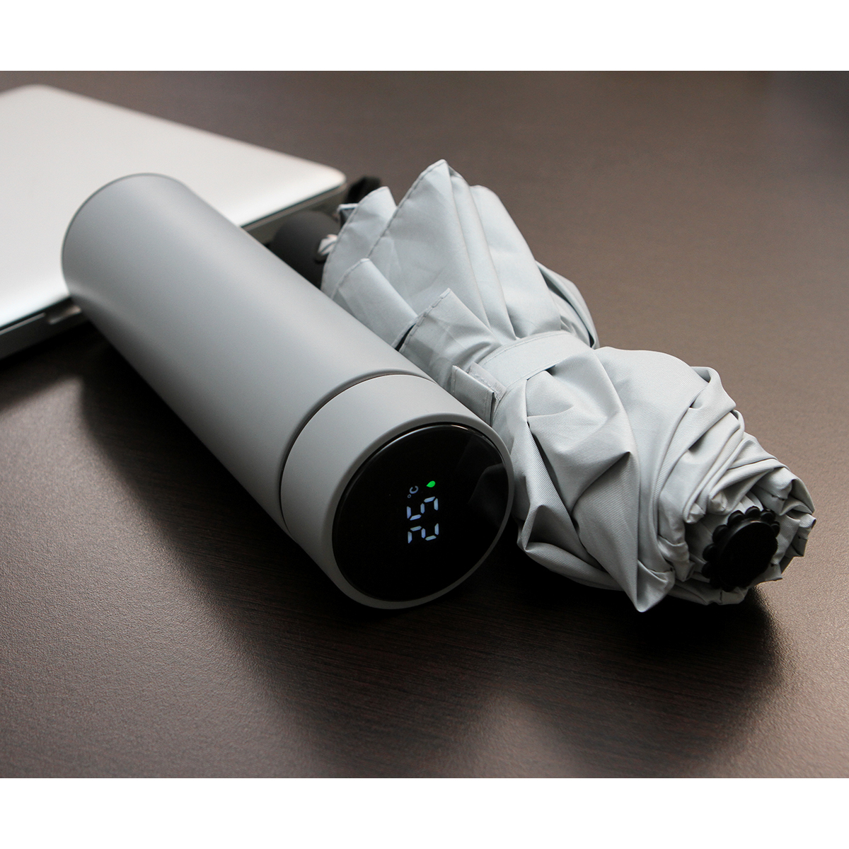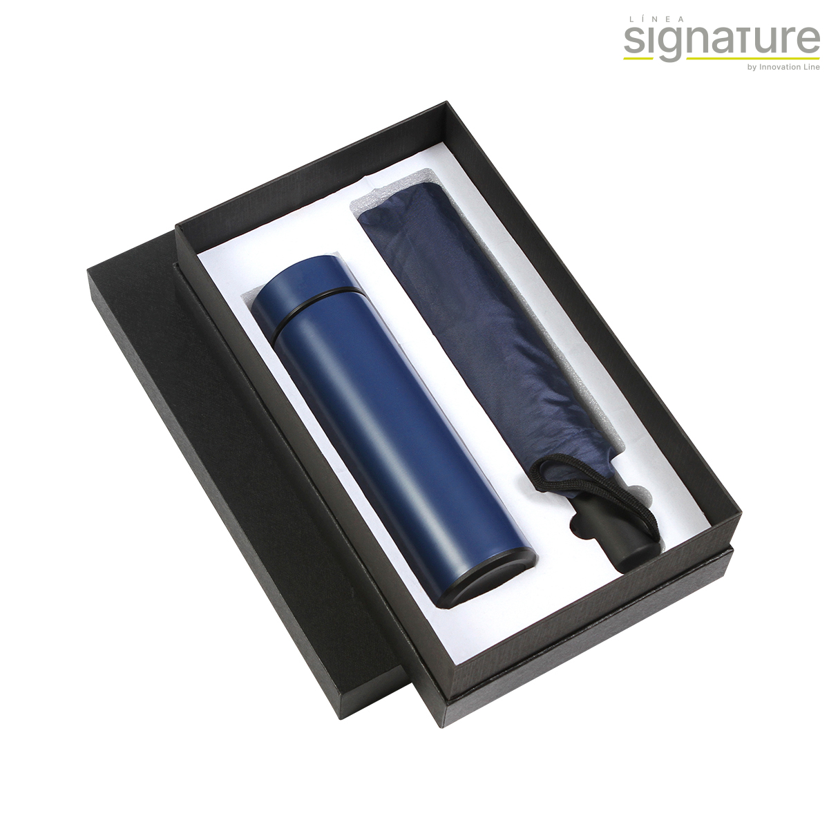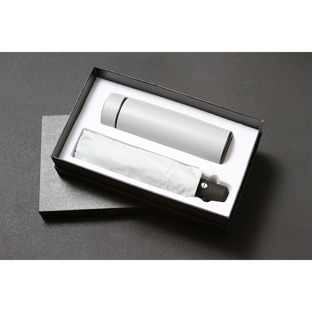 Set de regalo con paraguas de poliéster con apertura automática y termo inteligente de acero inoxidable doble pared; con pantalla LED indicadora de temperatura interior en la tapa. Fabricado en materiales de grado alimenticio, mantiene bebidas frías o calientes por un largo tiempo. La batería dura hasta 2 años. No usar en microondas. Capacidad de 500 ml. Incluye caja de cartón.