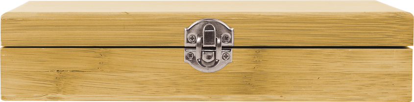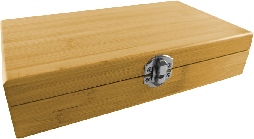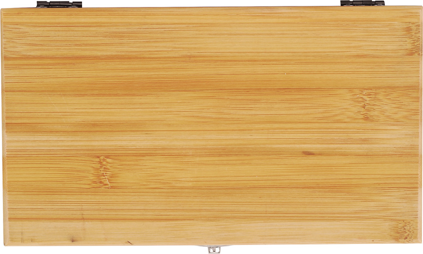 23 x 13 x 5 cm. Caja de bambú, cierre metálico con set de 5 piezas de bar: Sacacorchos, Tapón, Termómetro, Anillo cortagota y Tapón vertedor.
